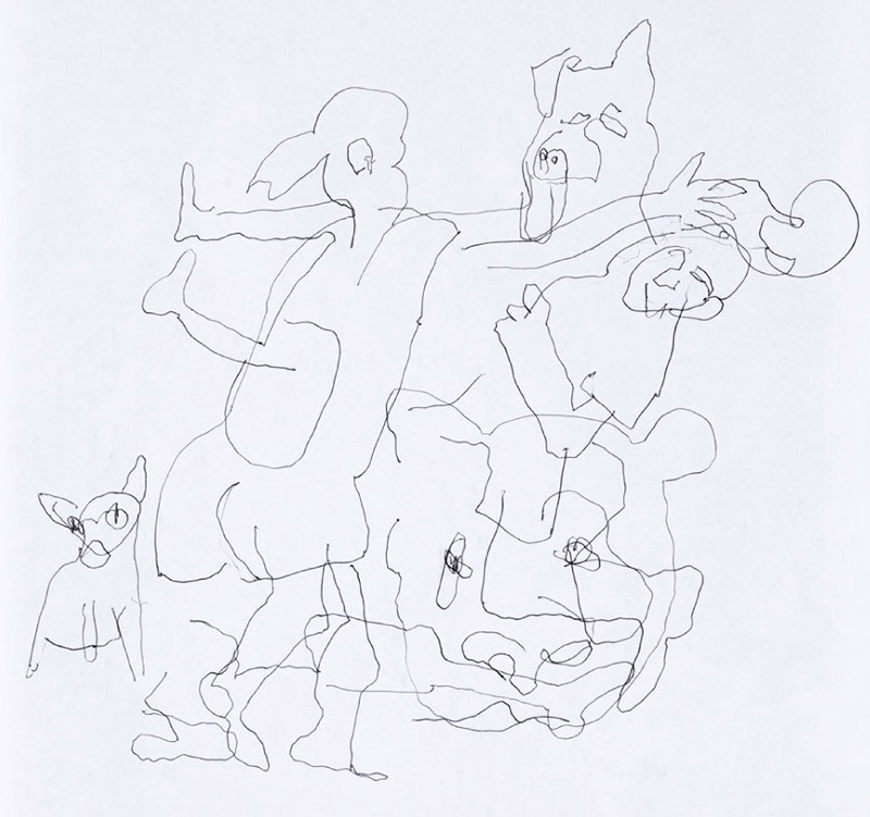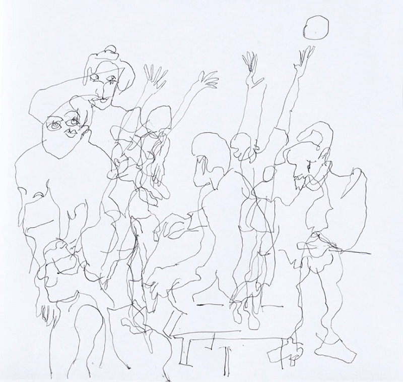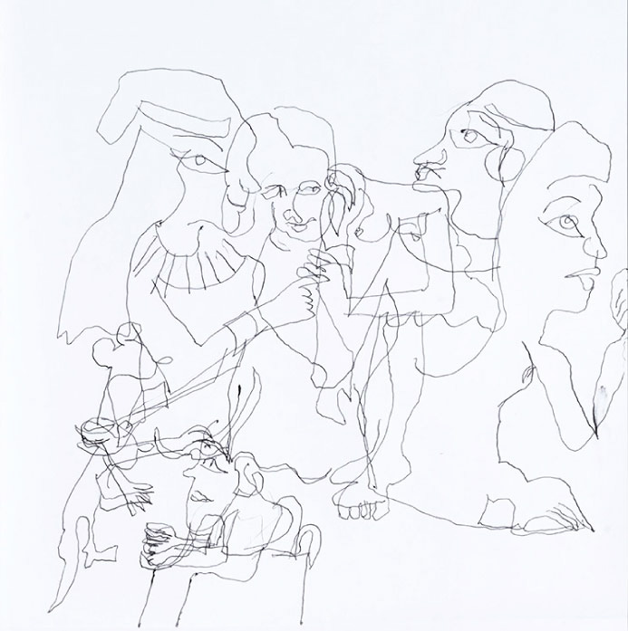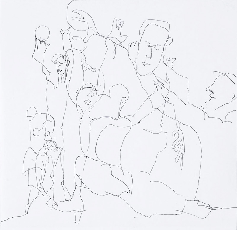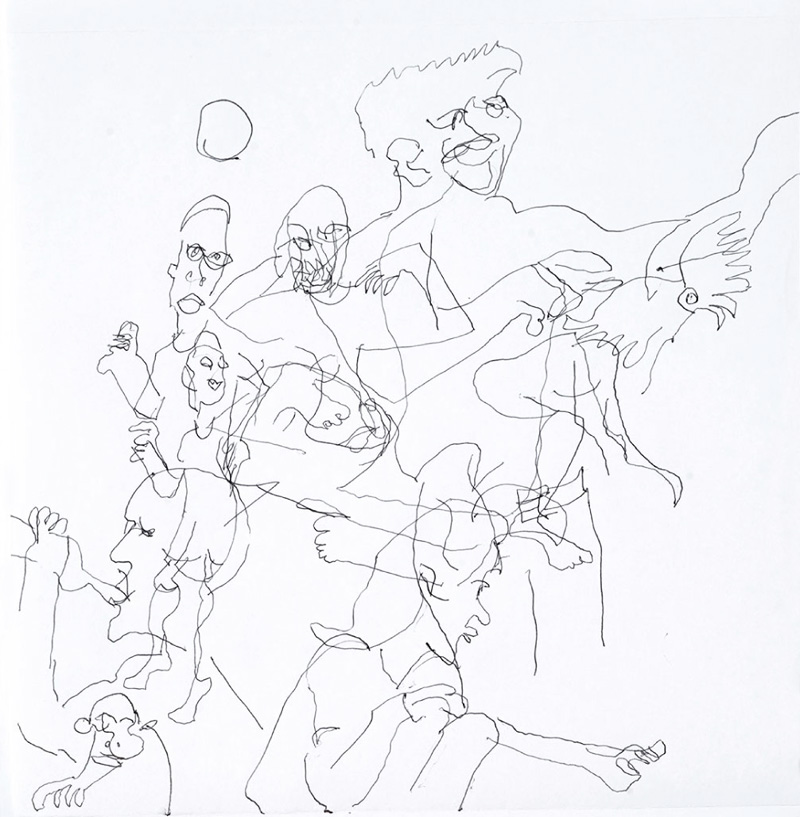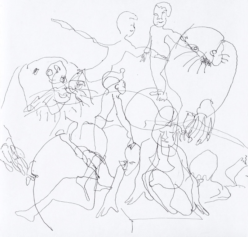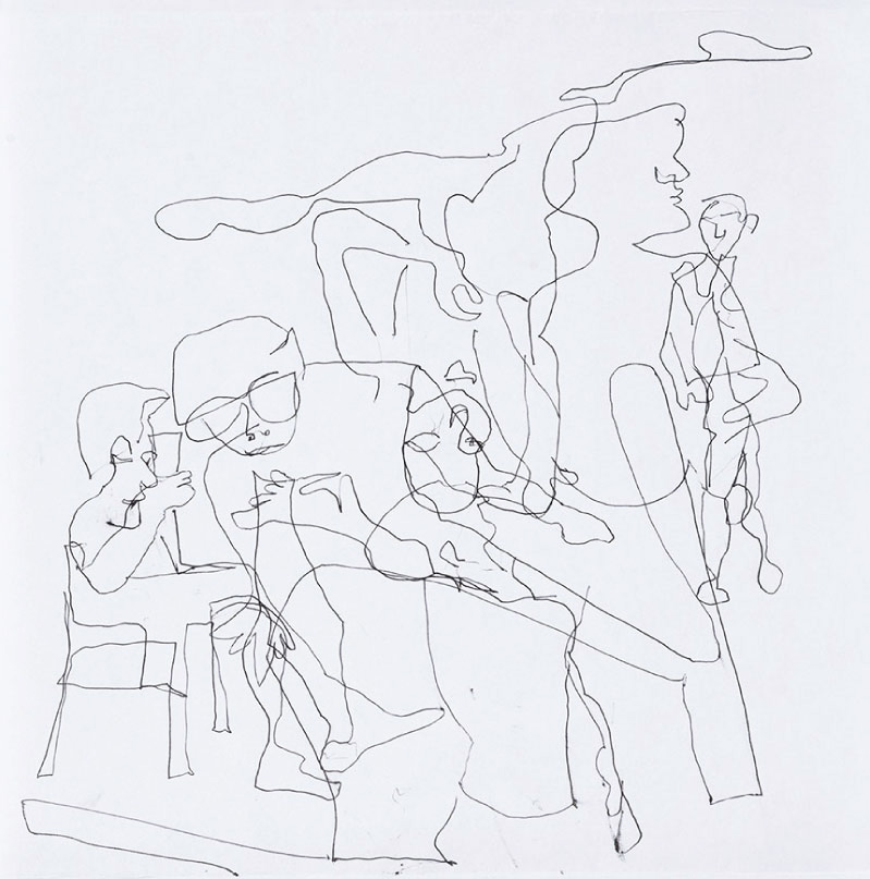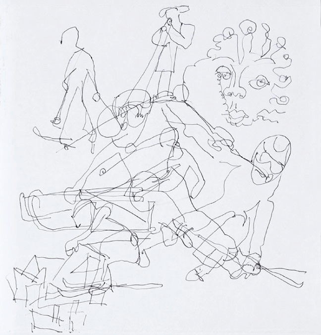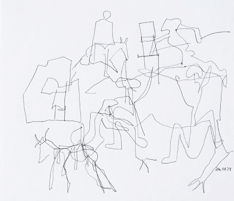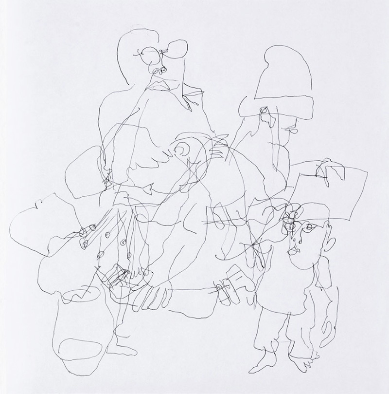 20 Leporellos (je 172×23 cm) mit jeweils 7 Zeichnungen mit Kugelschreiber, vertikal hängend.
