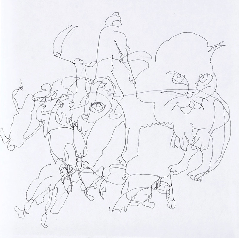 Freie, sich überschneidende, ineinanderlaufende Motive. Blind nach Vorlagen von Natur oder Bildern angelegt. Dabei wird man von Linien und Dingen überrascht, die man selbst nicht so planen kann.