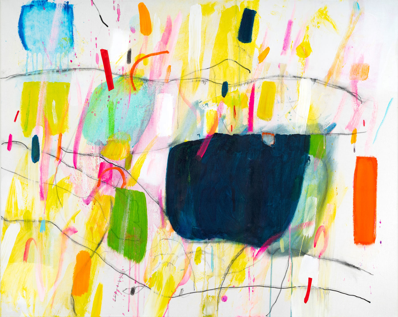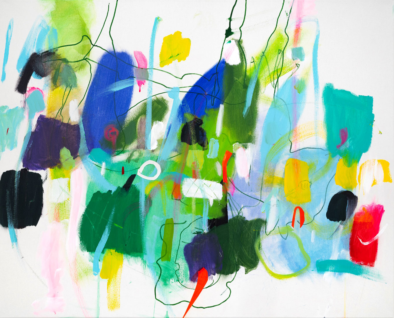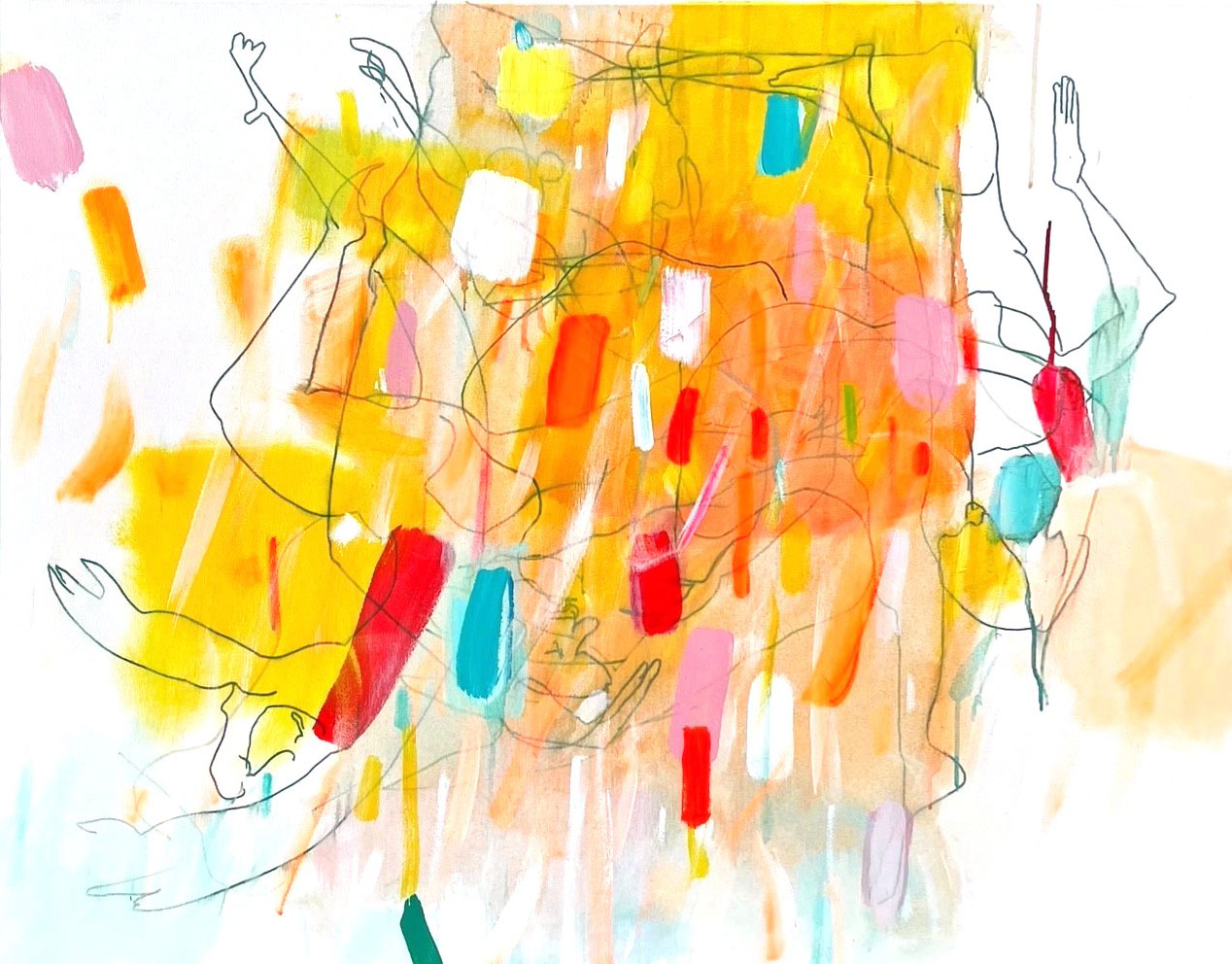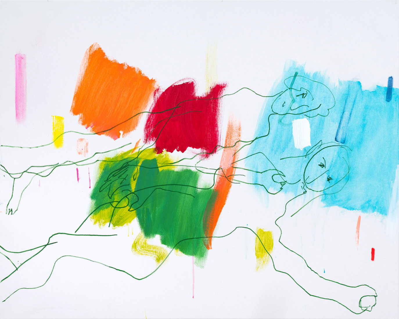 Diese tauchen aus den Farbformen auf, um dann wieder hinter ihnen zu verschwinden. Sie sind mal sichtbar, mal unsichtbar, mal gegenständlich oder rein linear.