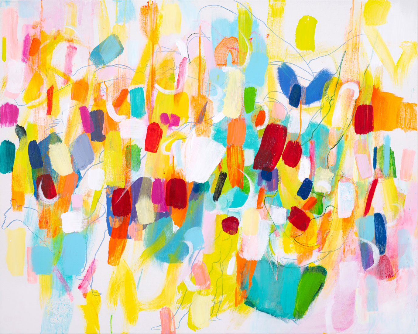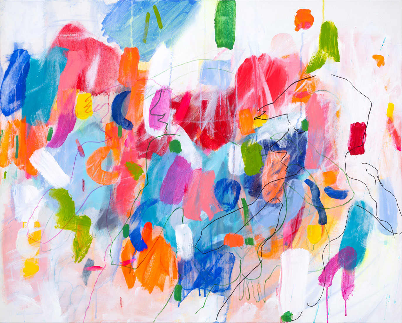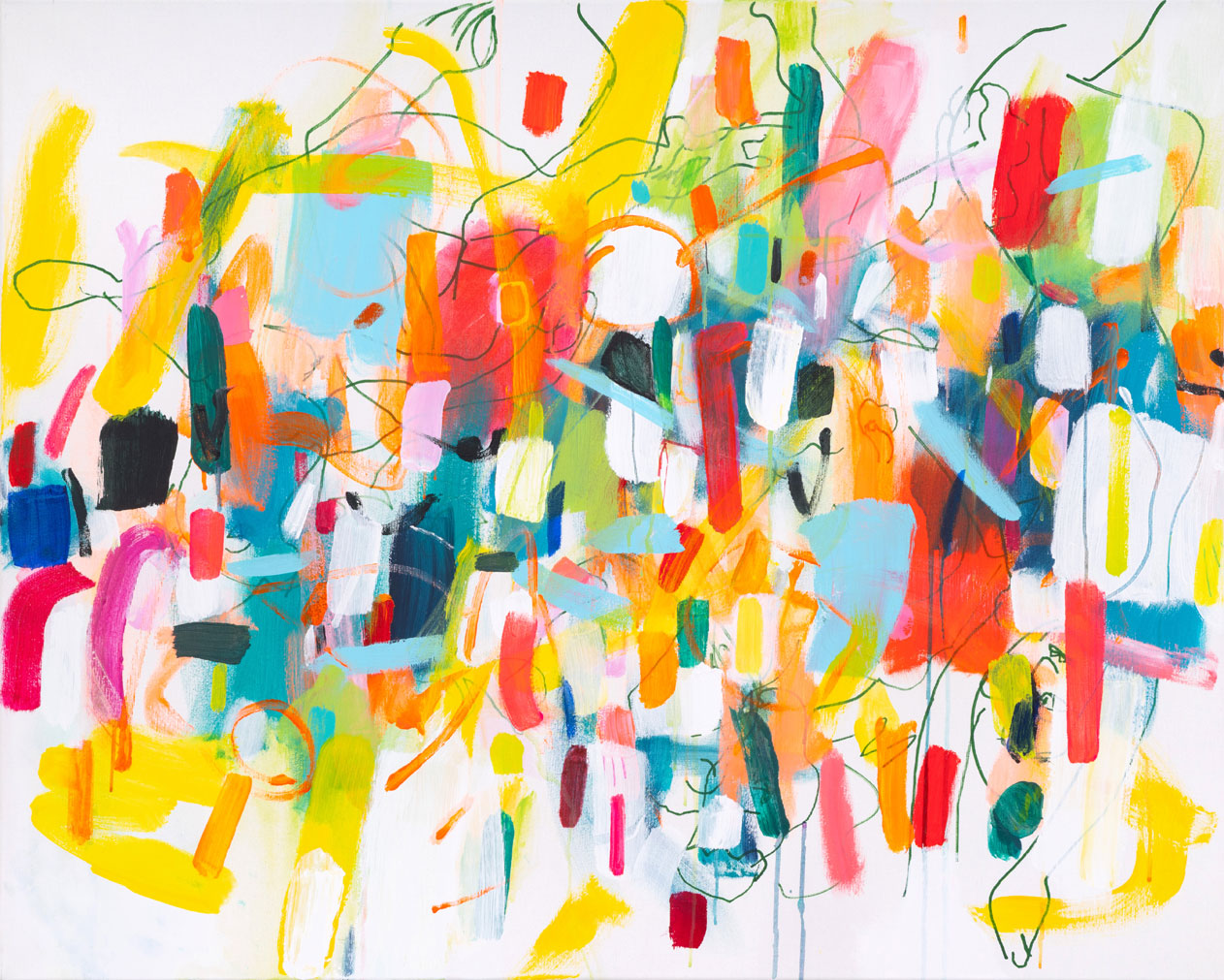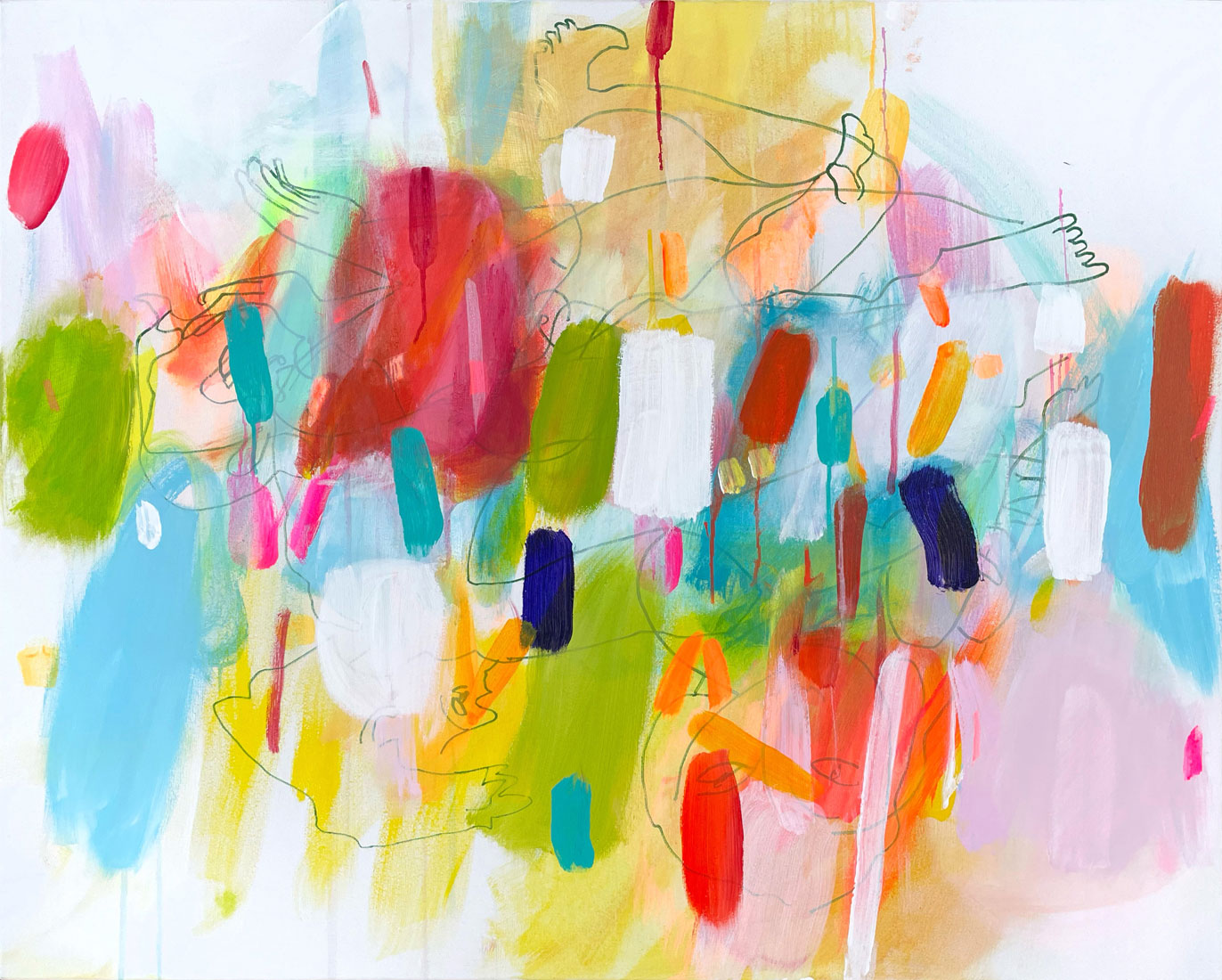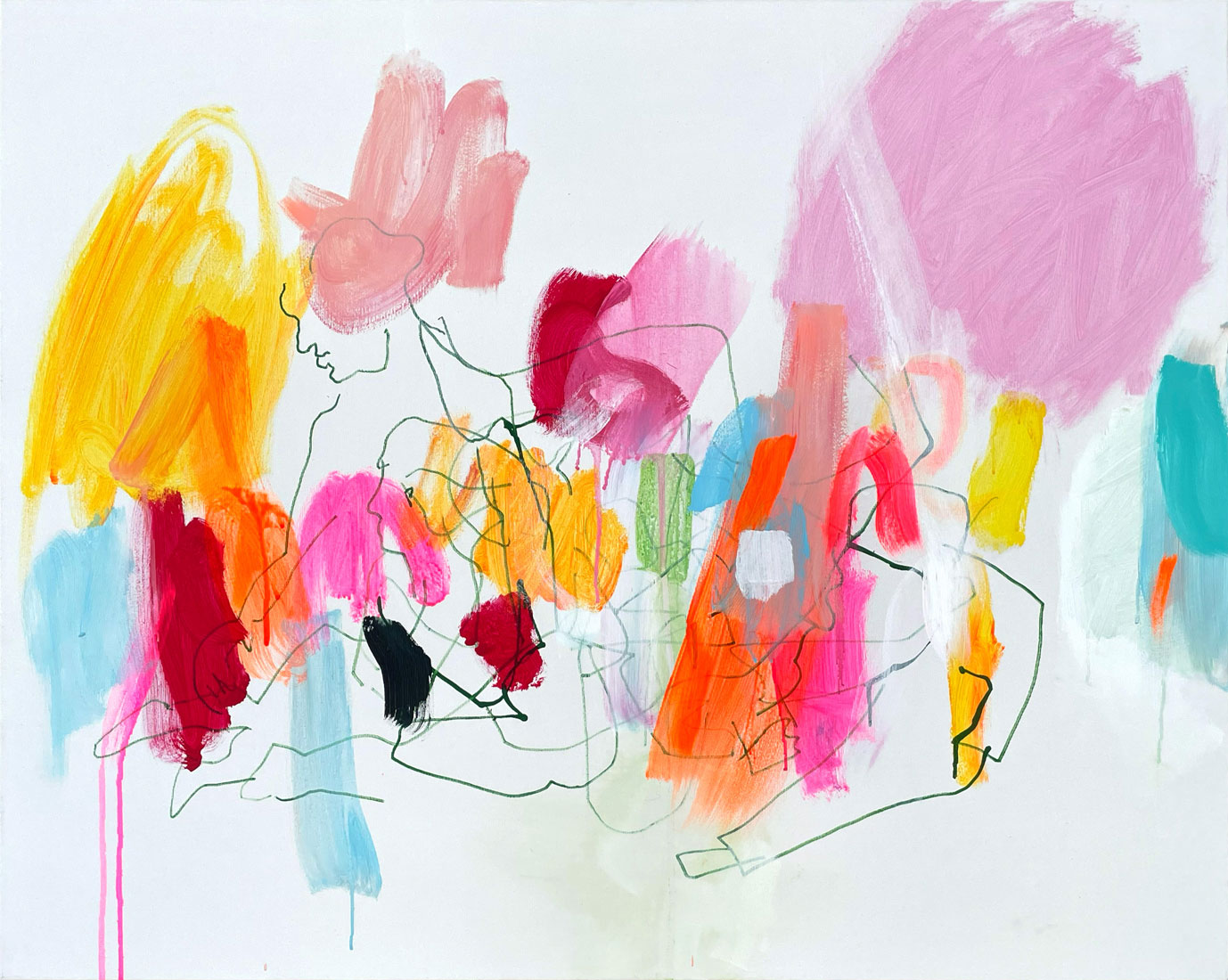 Diese tauchen aus den Farbformen auf, um dann wieder hinter ihnen zu verschwinden. Sie sind mal sichtbar, mal unsichtbar, mal gegenständlich oder rein linear.