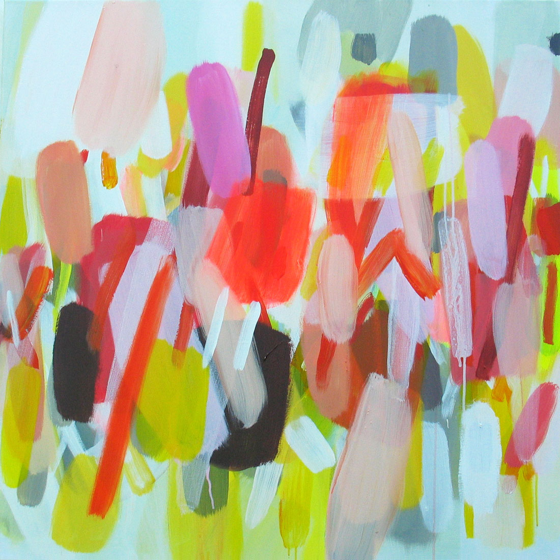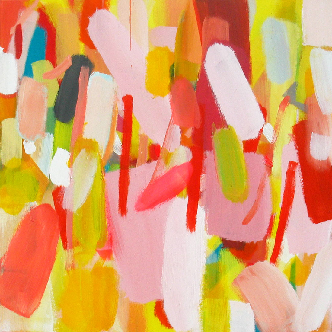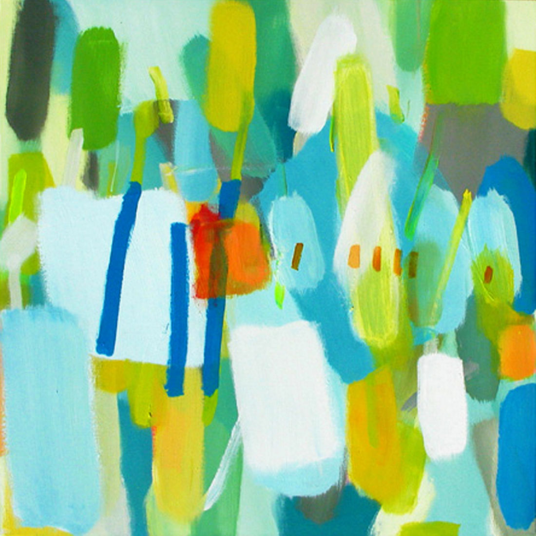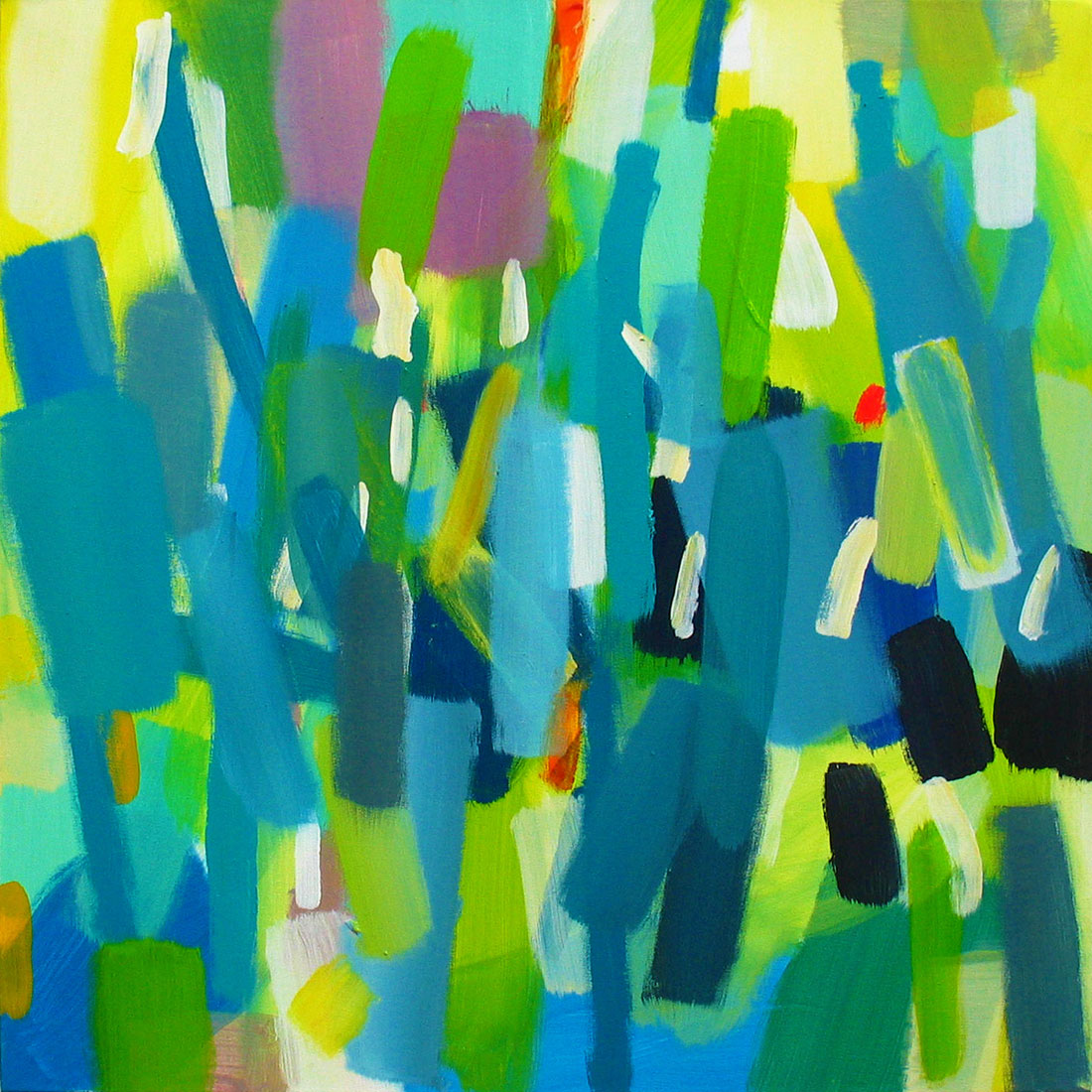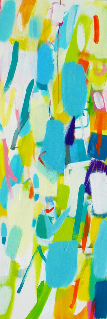 Wollte man Helga von Jena kunsthistorisch einordnen, müsste man sie mit dem Etikett „Informell“ versehen. Mir kommt jedoch immer auch etwas anderes in den Sinn: Auf mich wirken ihre Gemälde, die so offen sind und auch nicht begrenzt durch einen festen Rahmen, wie ein Blick auf die Bestandteile der Kunstwelt, als würde man mit einer starken Lupe vor einem Bild von Monet, Sisley oder Seurat stehen und ihre lichtdurchfluteten Landschaften und Stadträume um ein Vielfaches vergrößern. Farbe liegt neben Farbe, überlagert andere Farbfelder, webt ein Muster aus Flecken, das jedoch immer transparent und luftig bleibt.