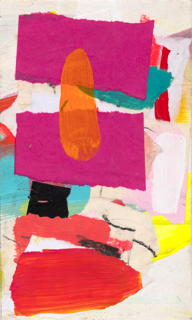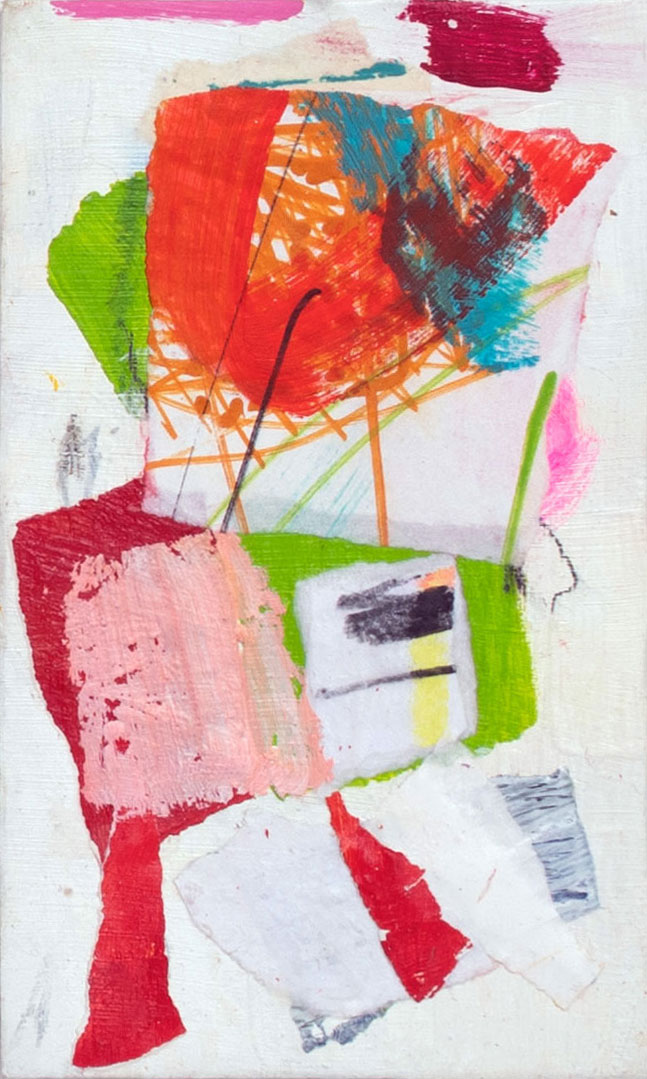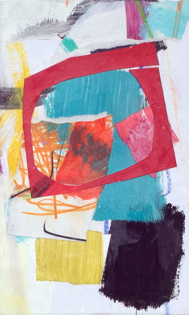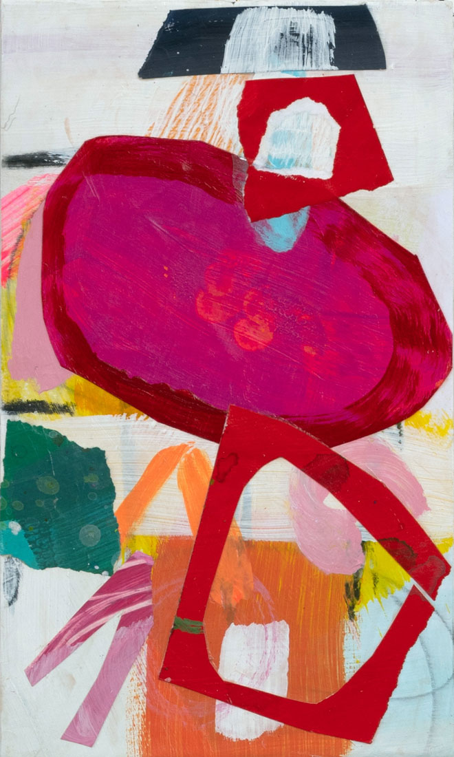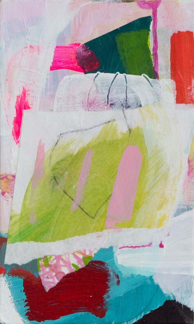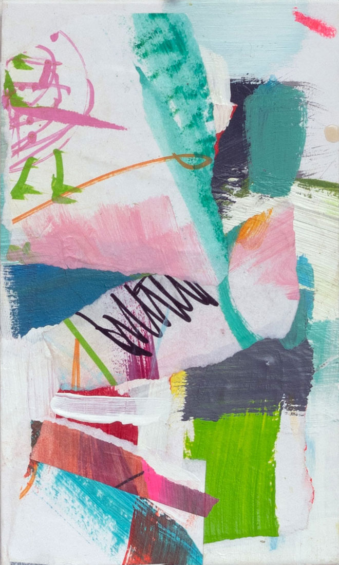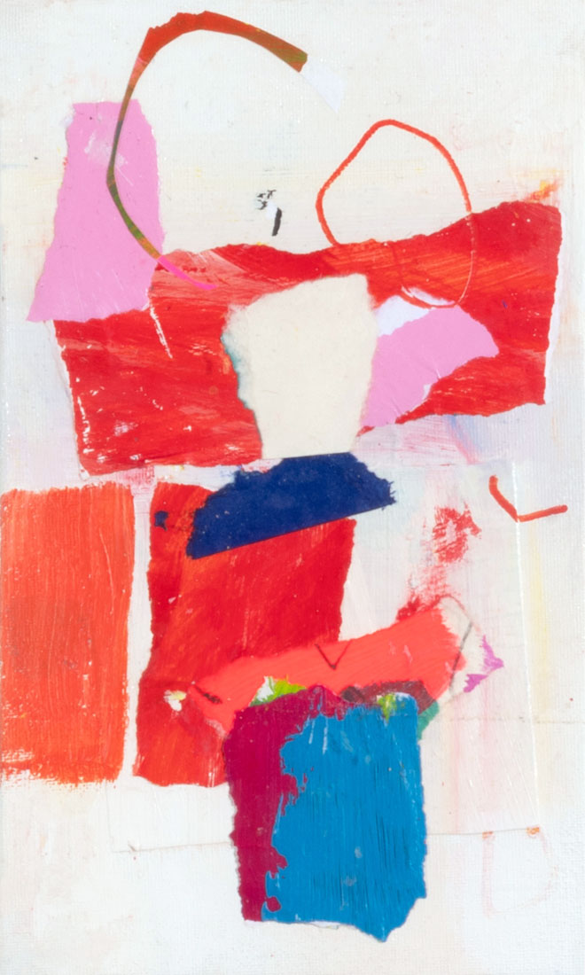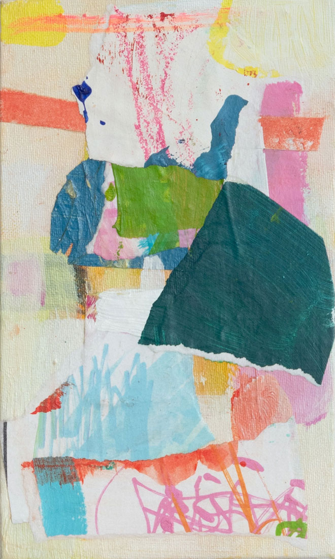 Kleinformatige Collagen auf Karton (25×15 cm) scheinen unvollendet, deuten nur etwas an, regen zu individuellen Gedanken, Gefühlen und Assoziationen an.