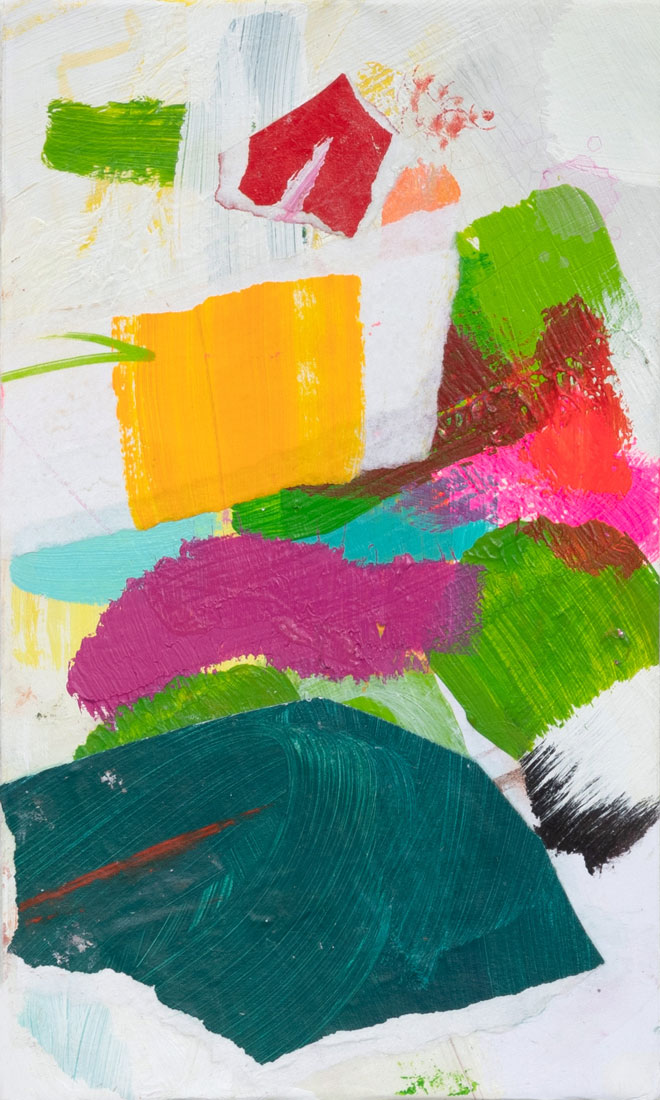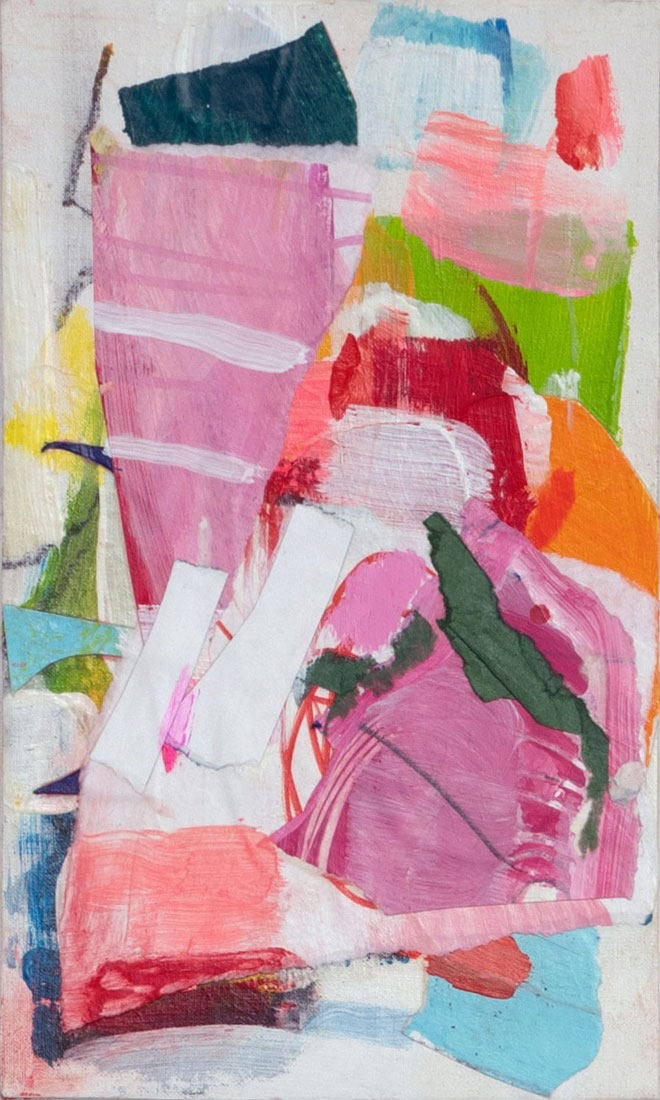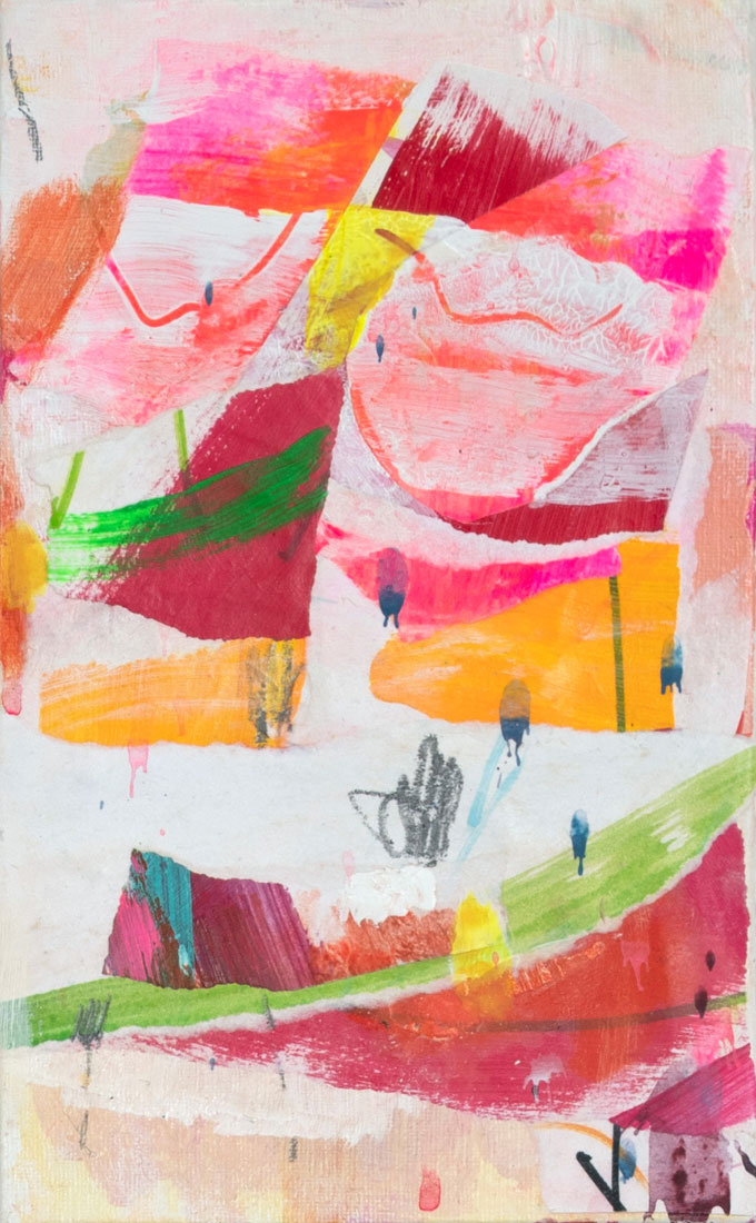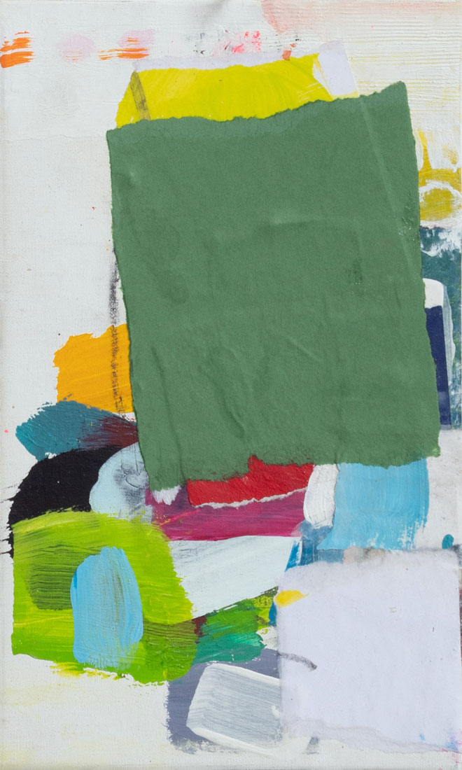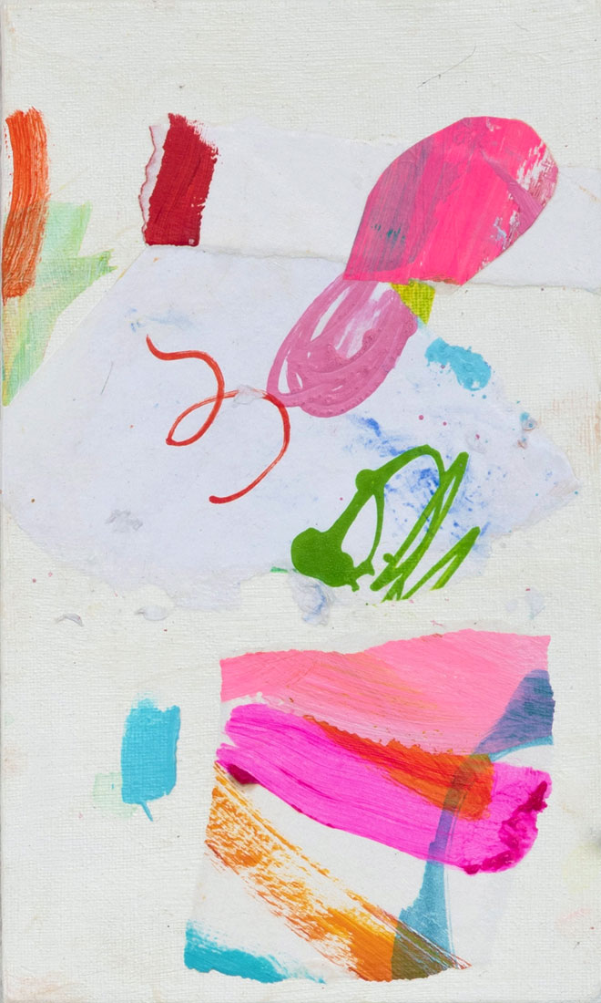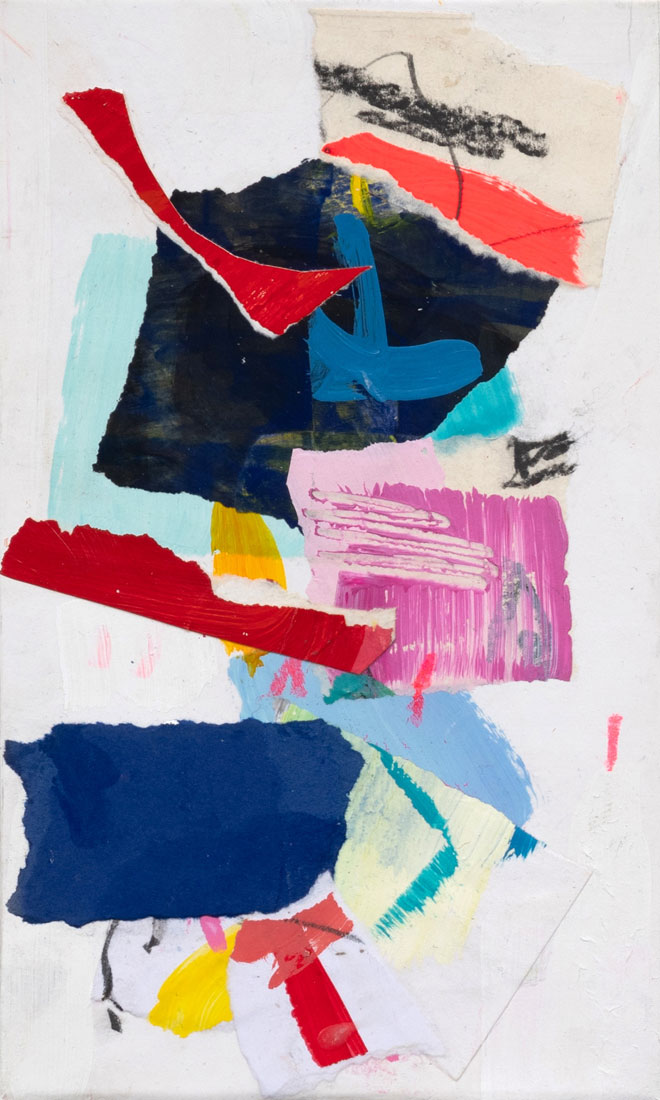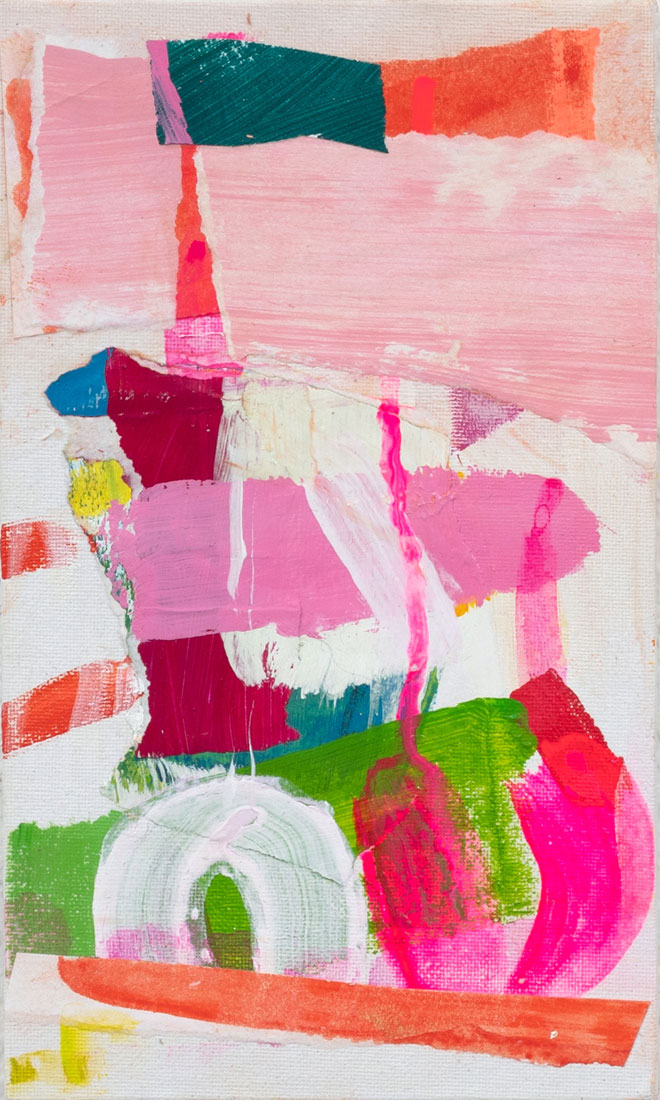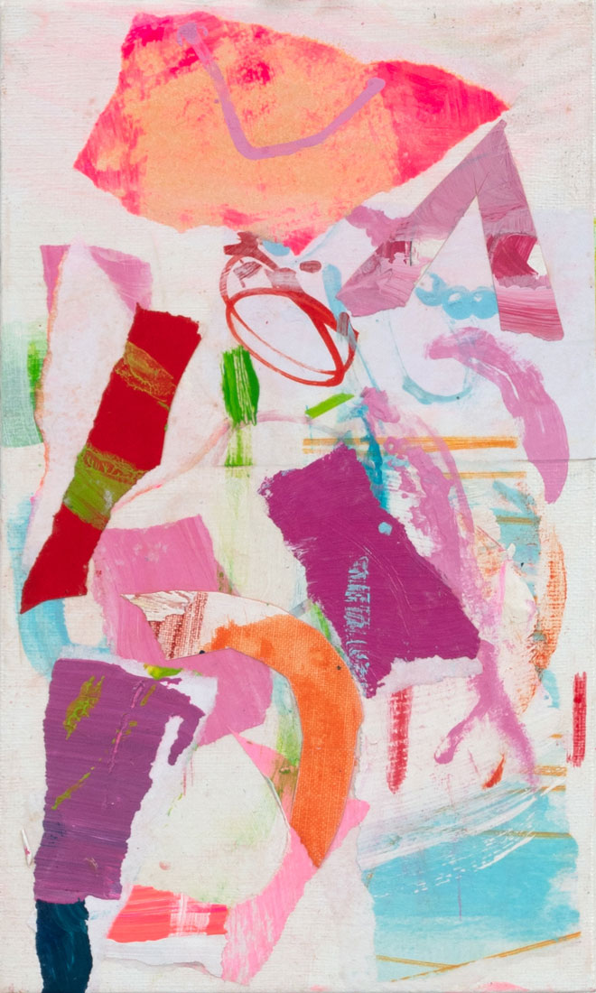 Kleinformatige Collagen auf Karton (25×15 cm) scheinen unvollendet, deuten nur etwas an, regen zu individuellen Gedanken, Gefühlen und Assoziationen an.