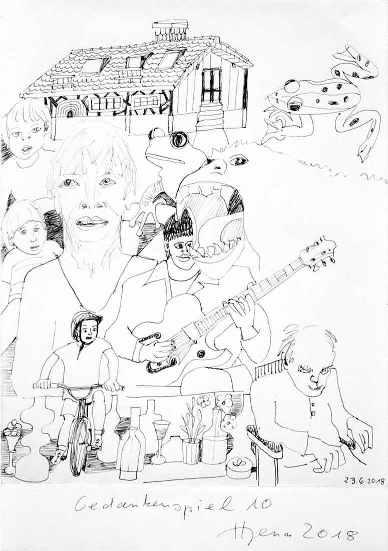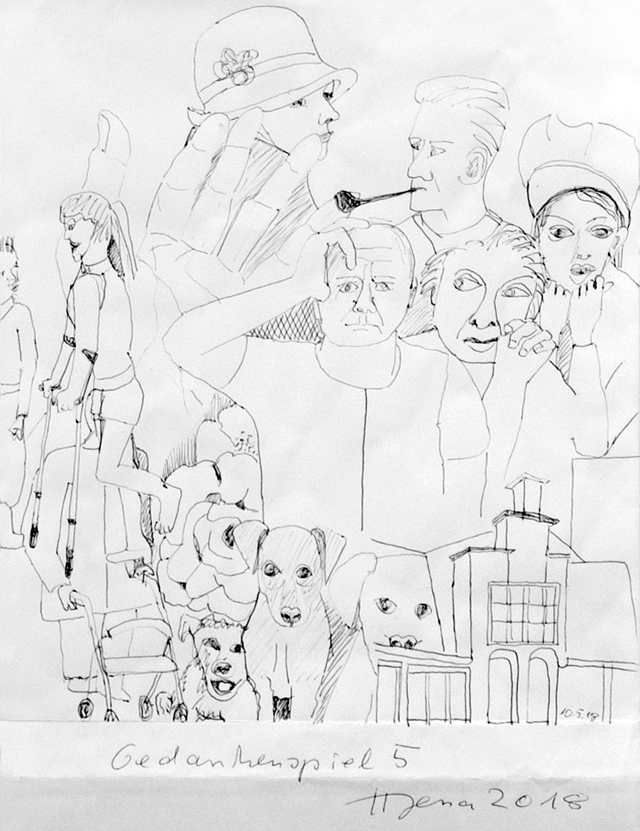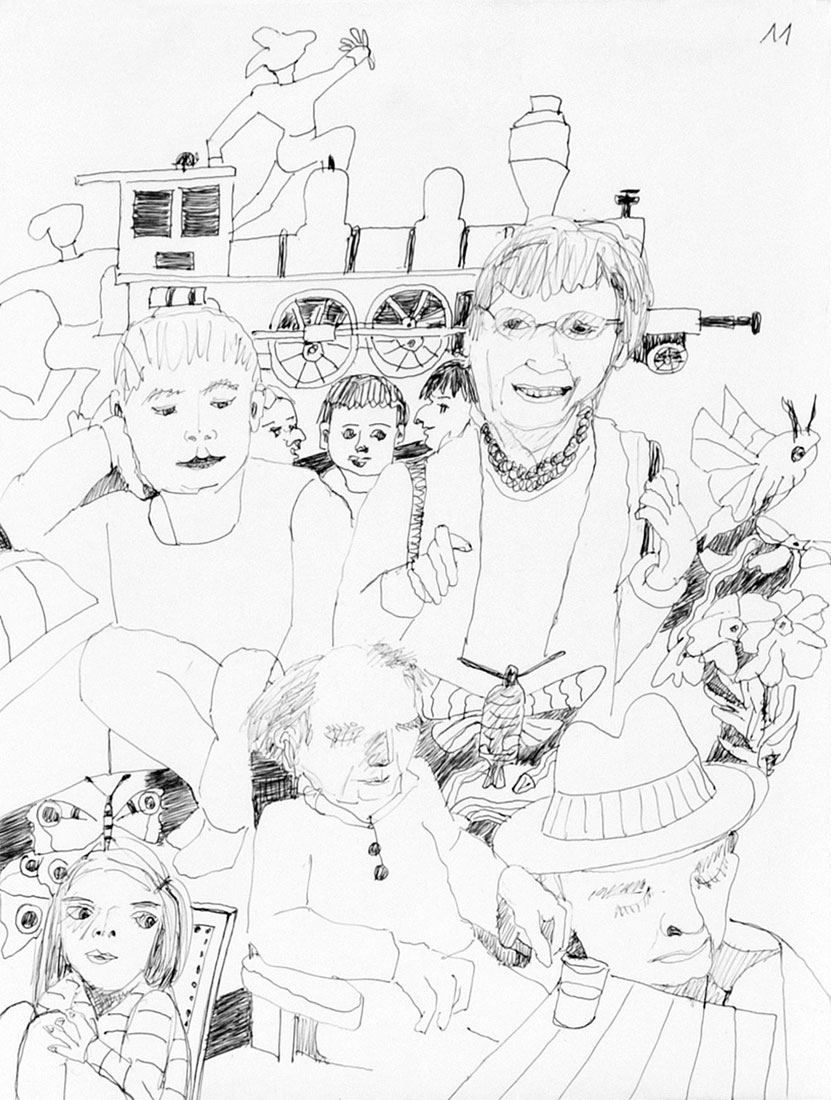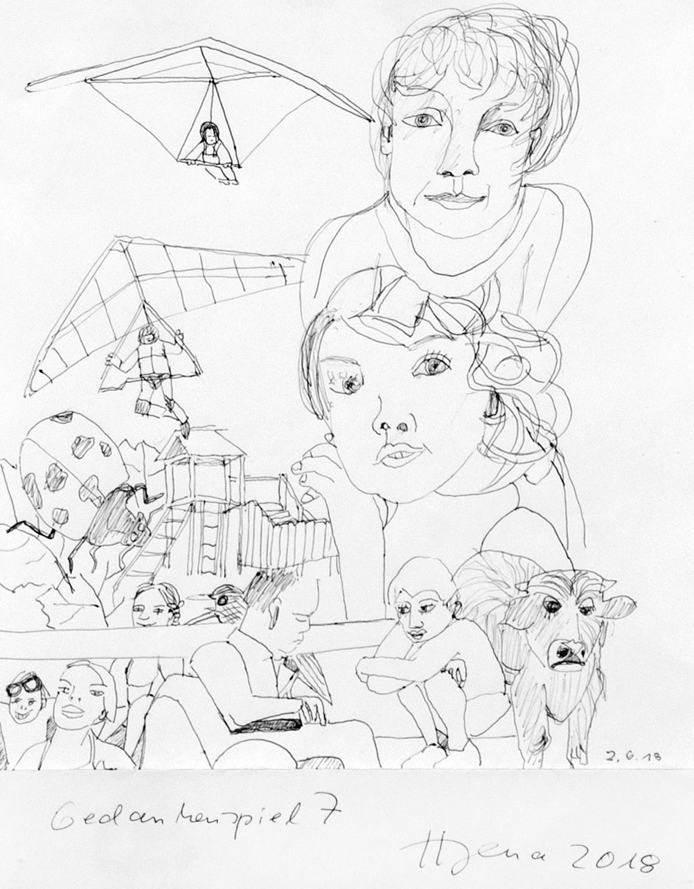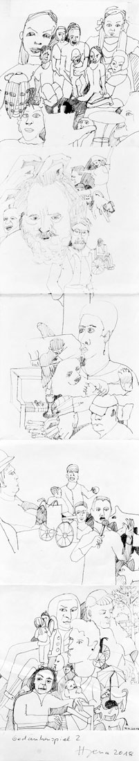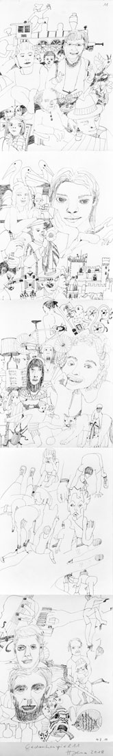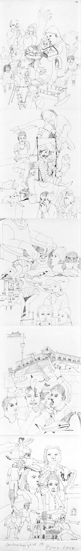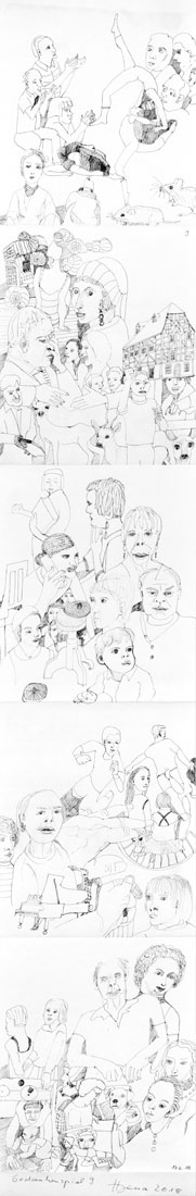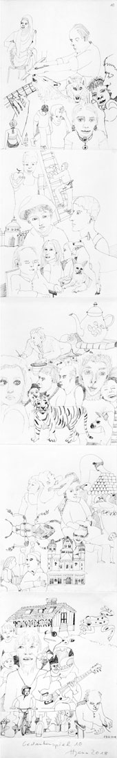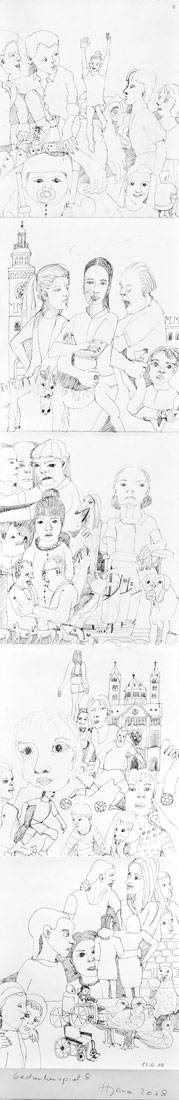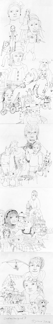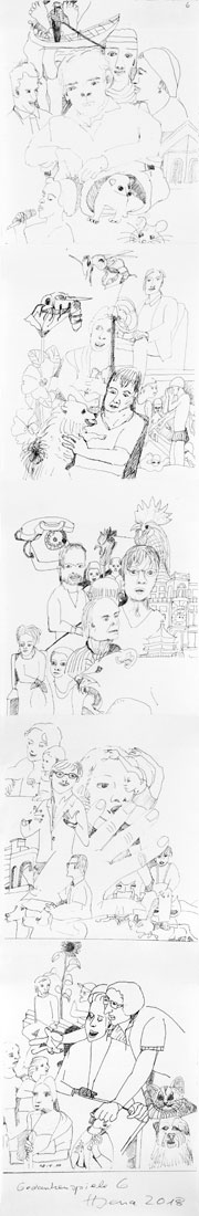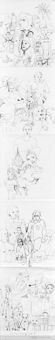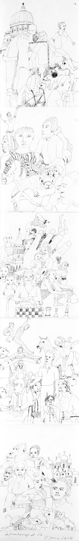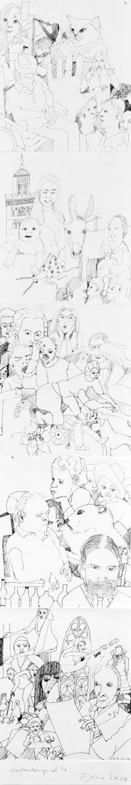 Kaleidoskopartig festgehaltene Szenen, was die Künstlerin sieht, träumt, denkt oder sich wünscht. Leporellos (je 160 x 23 cm) mit jeweils 5 Zeichnungen mit Kugelschreiber, vertikal hängend.