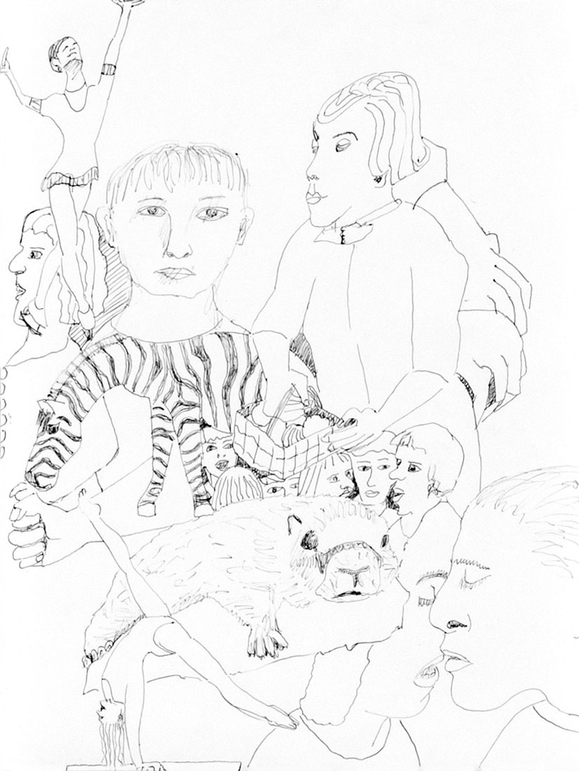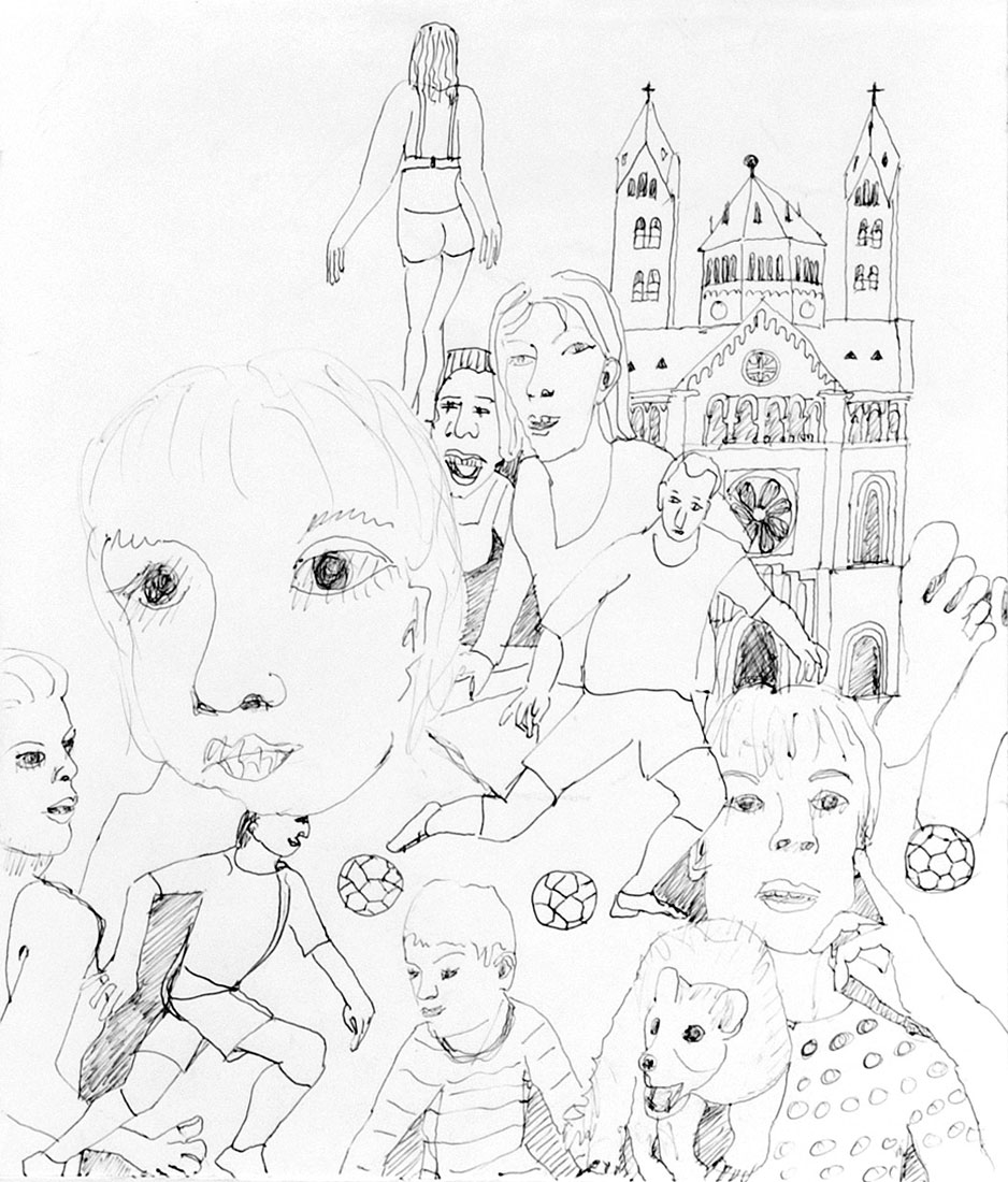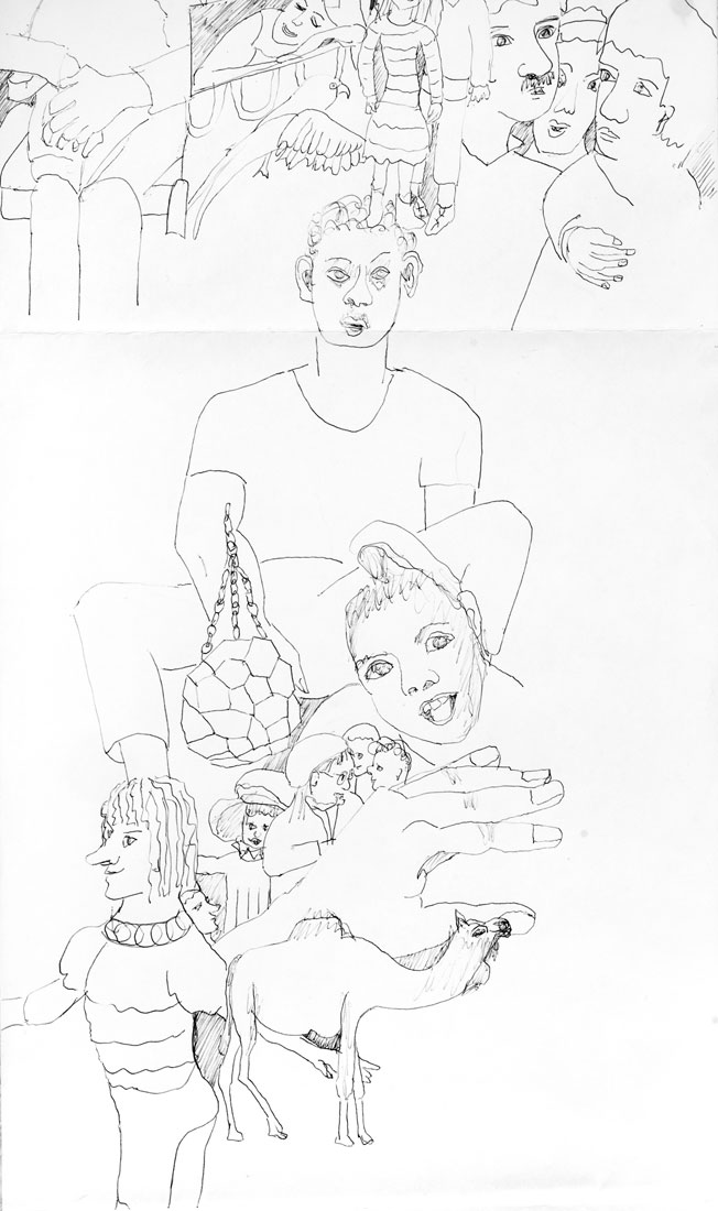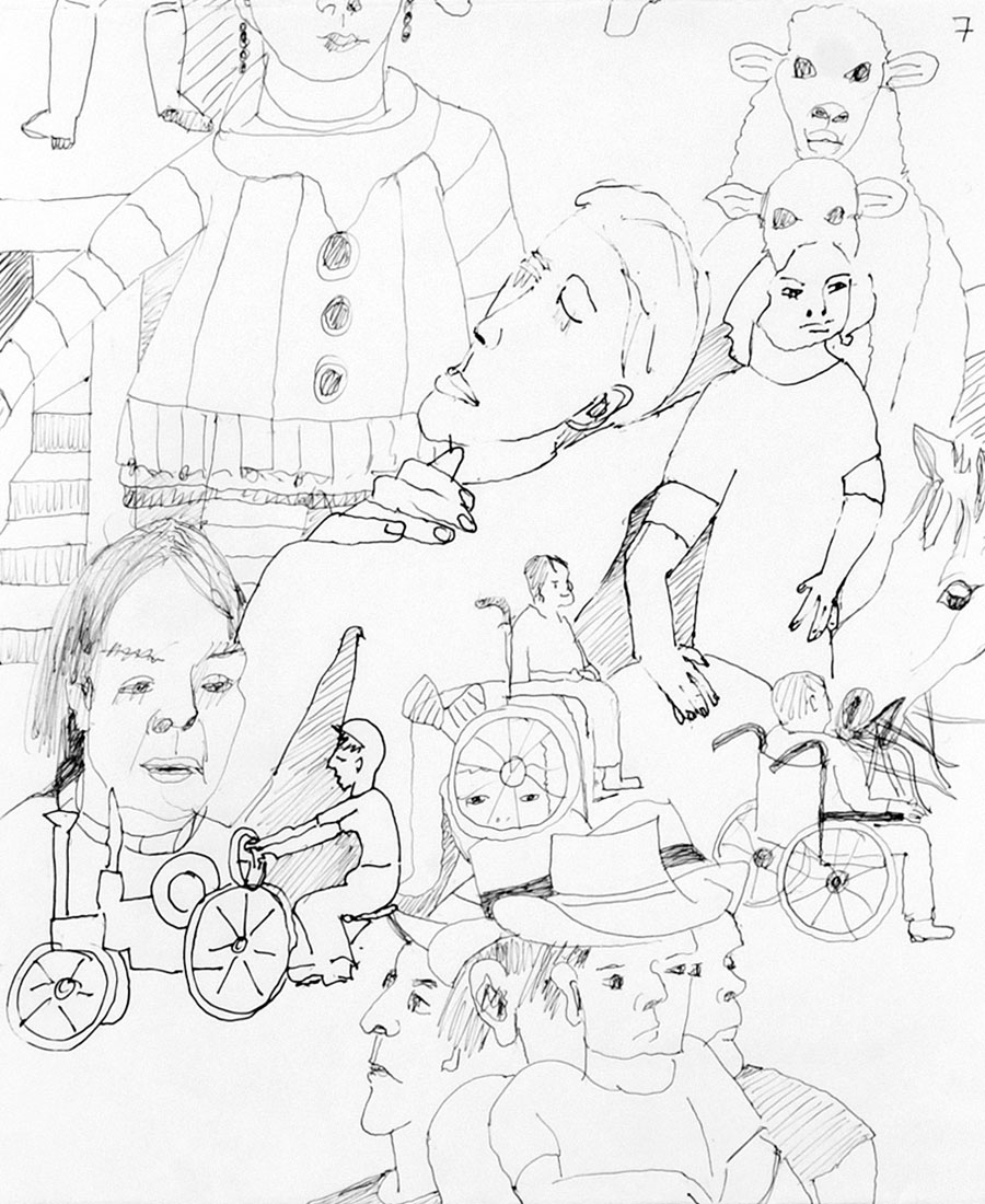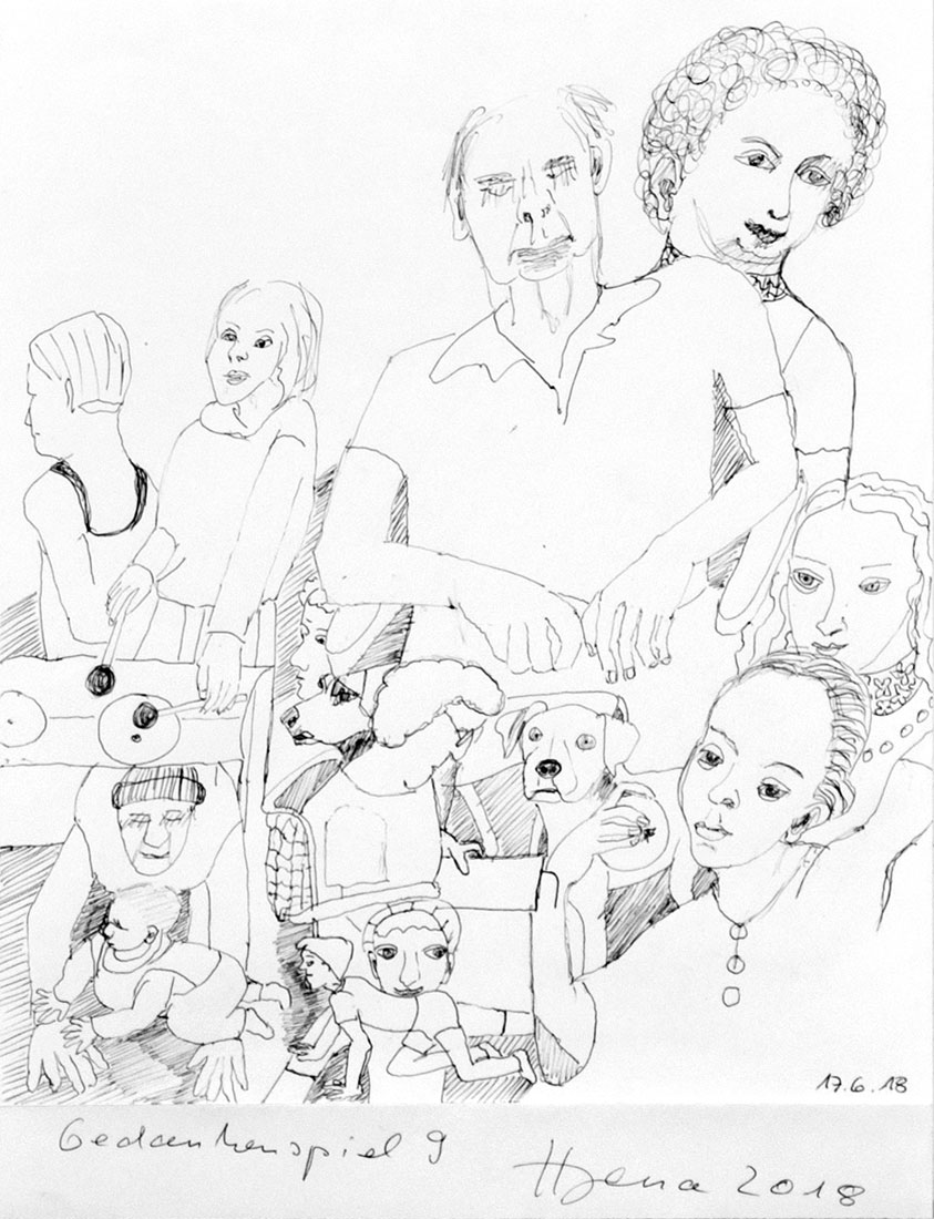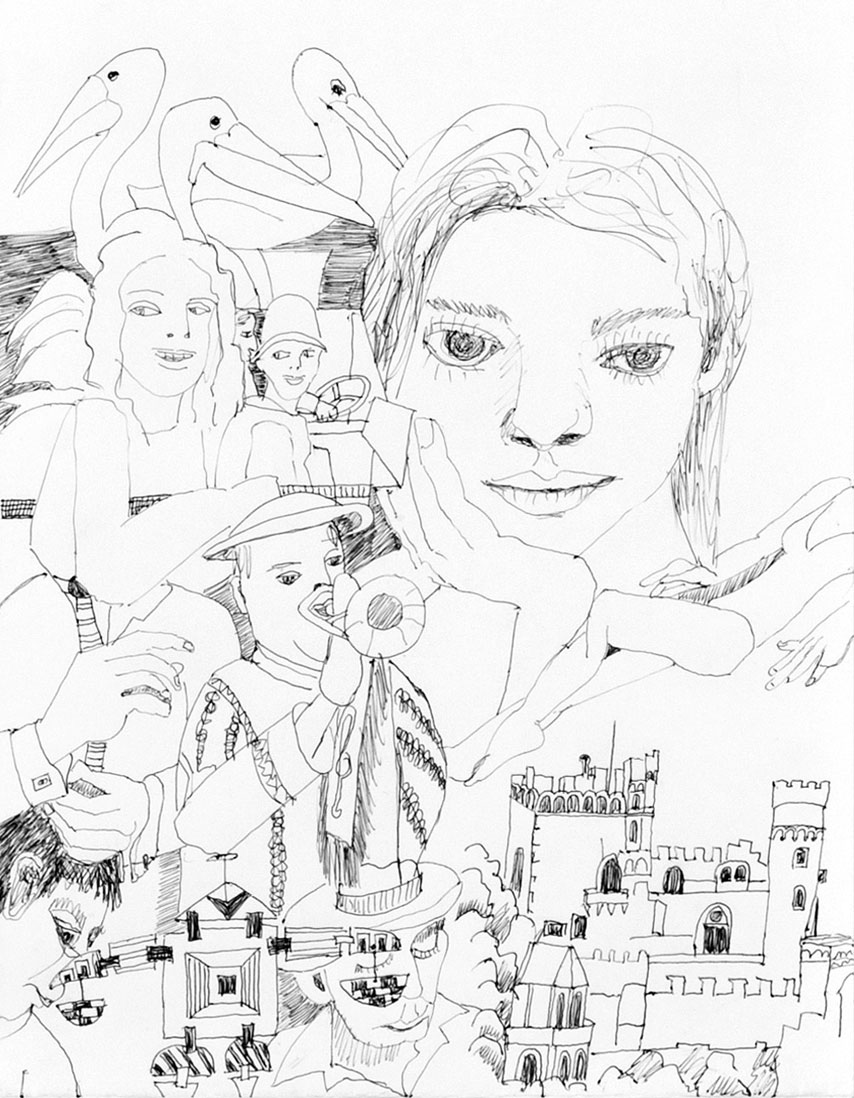 Kaleidoskopartig festgehaltene Szenen, was die Künstlerin sieht, träumt, denkt oder sich wünscht. Leporellos (je 160 x 23 cm) mit jeweils 5 Zeichnungen mit Kugelschreiber, vertikal hängend.