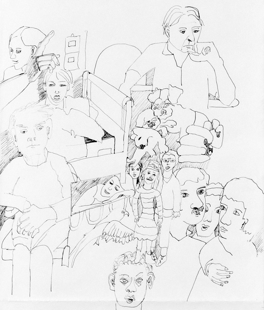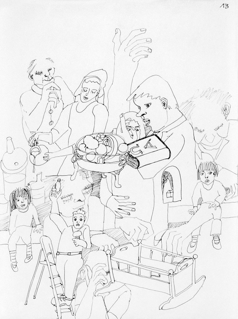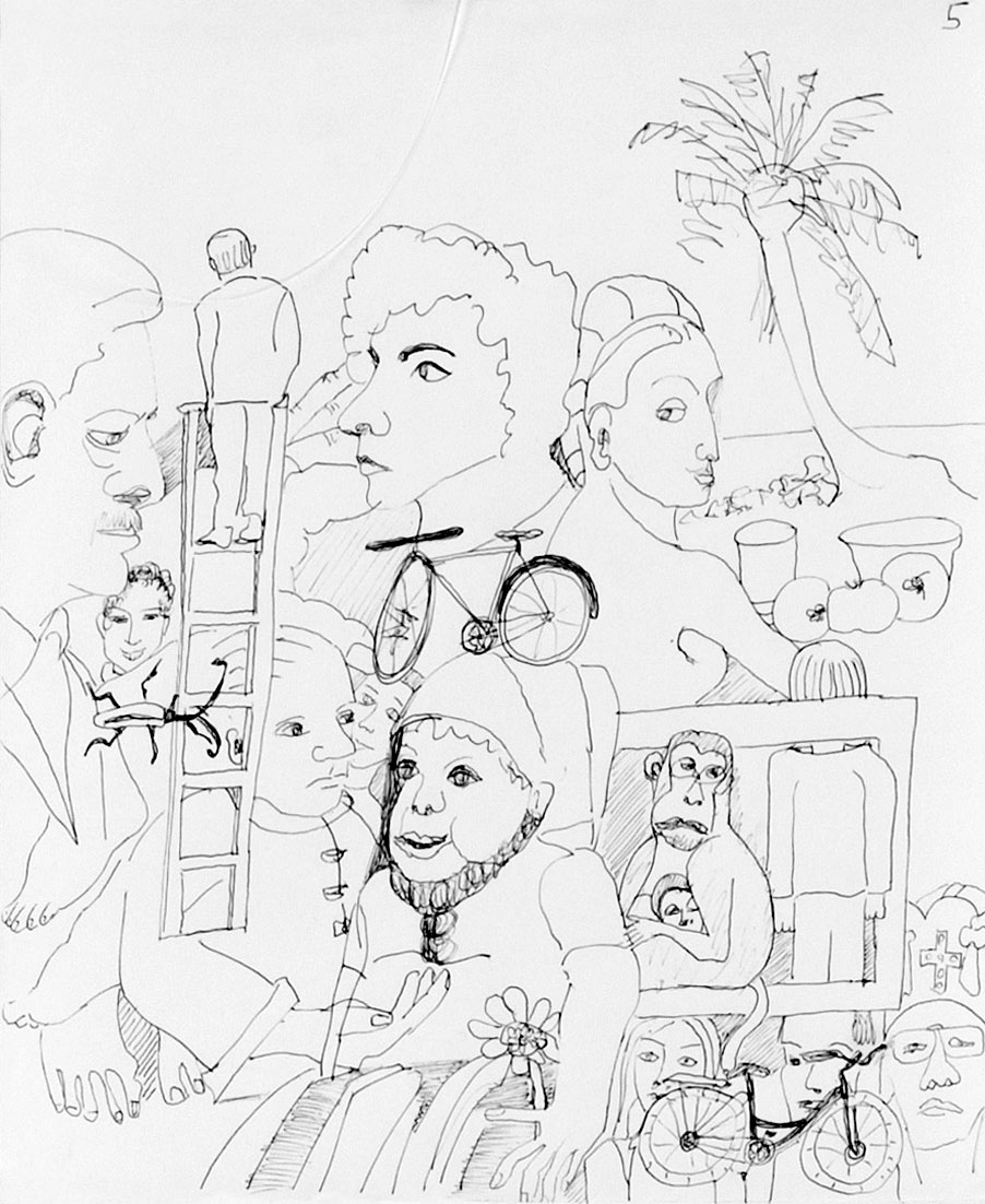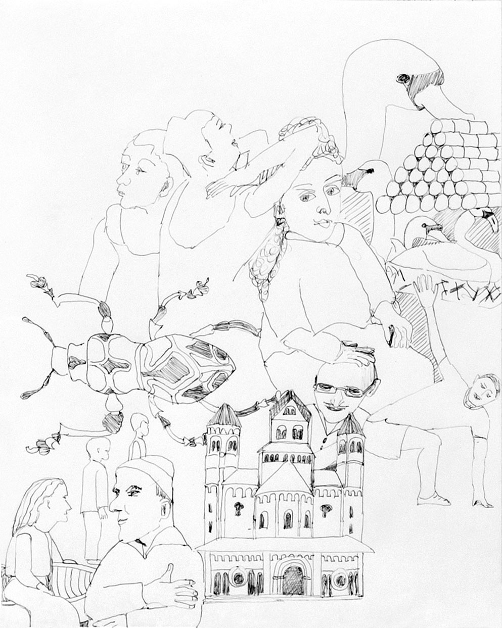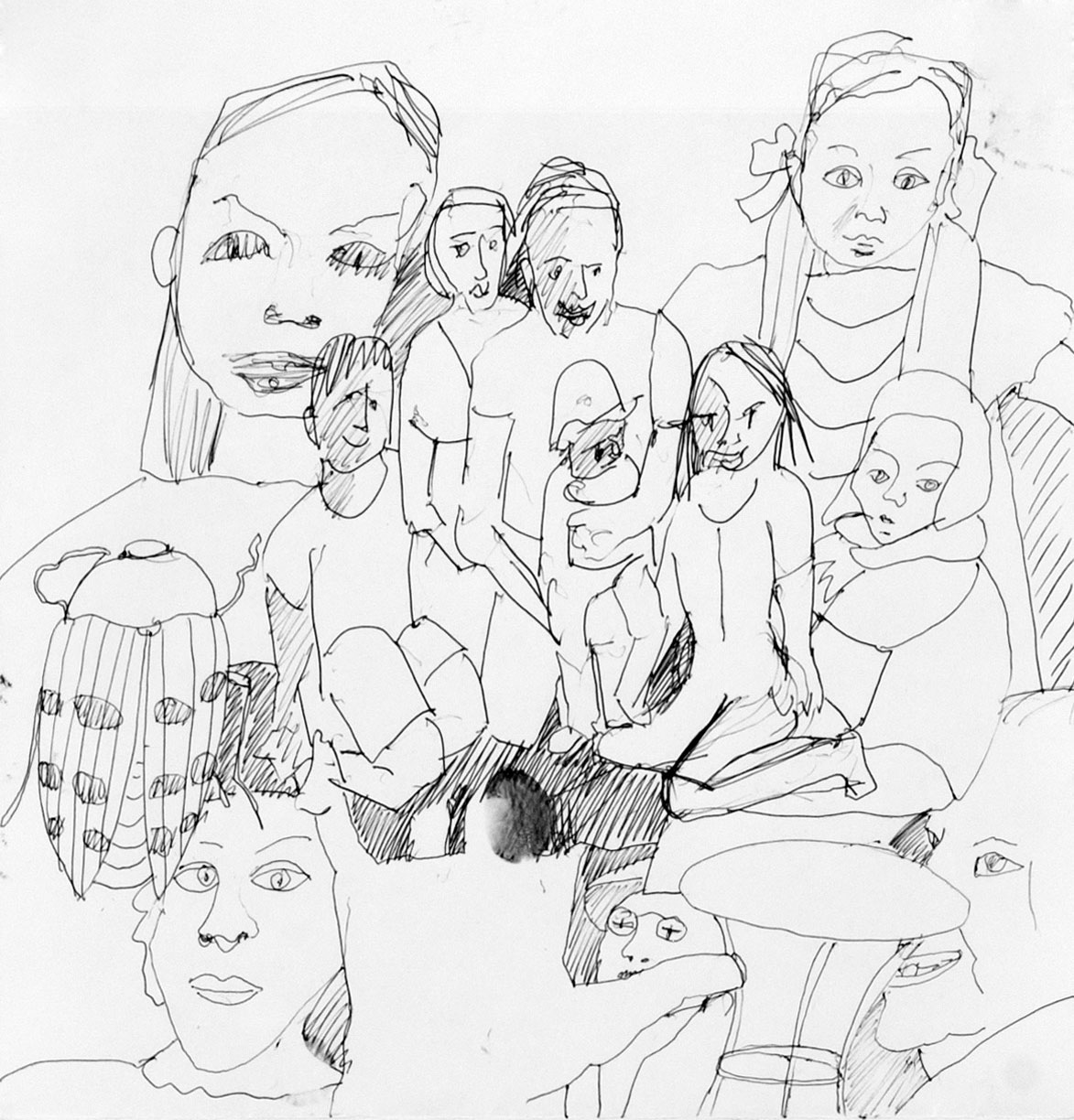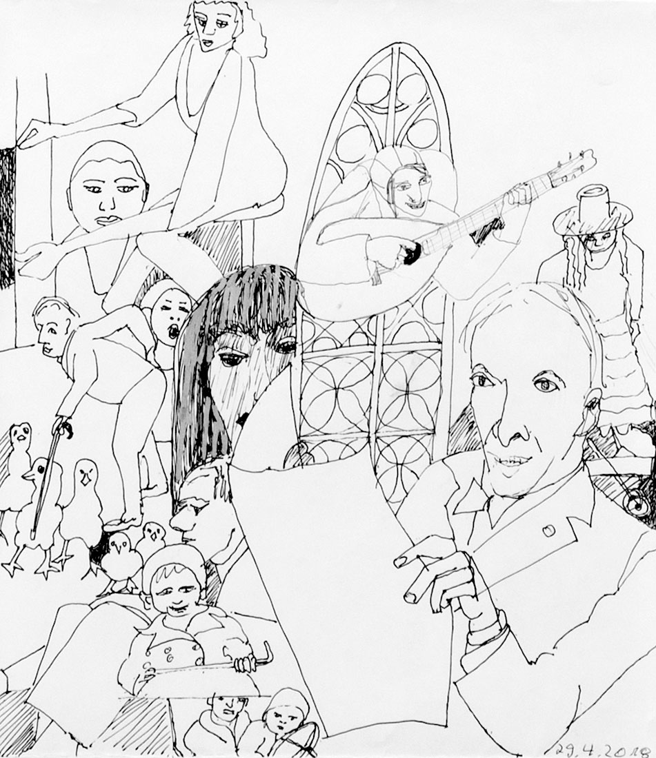 Kaleidoskopartig festgehaltene Szenen, was die Künstlerin sieht, träumt, denkt oder sich wünscht. Leporellos (je 160 x 23 cm) mit jeweils 5 Zeichnungen mit Kugelschreiber, vertikal hängend.