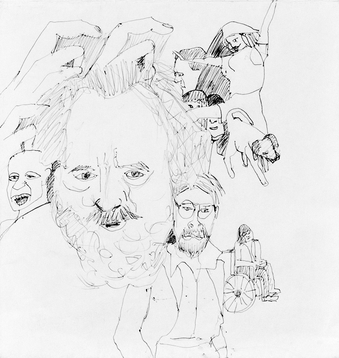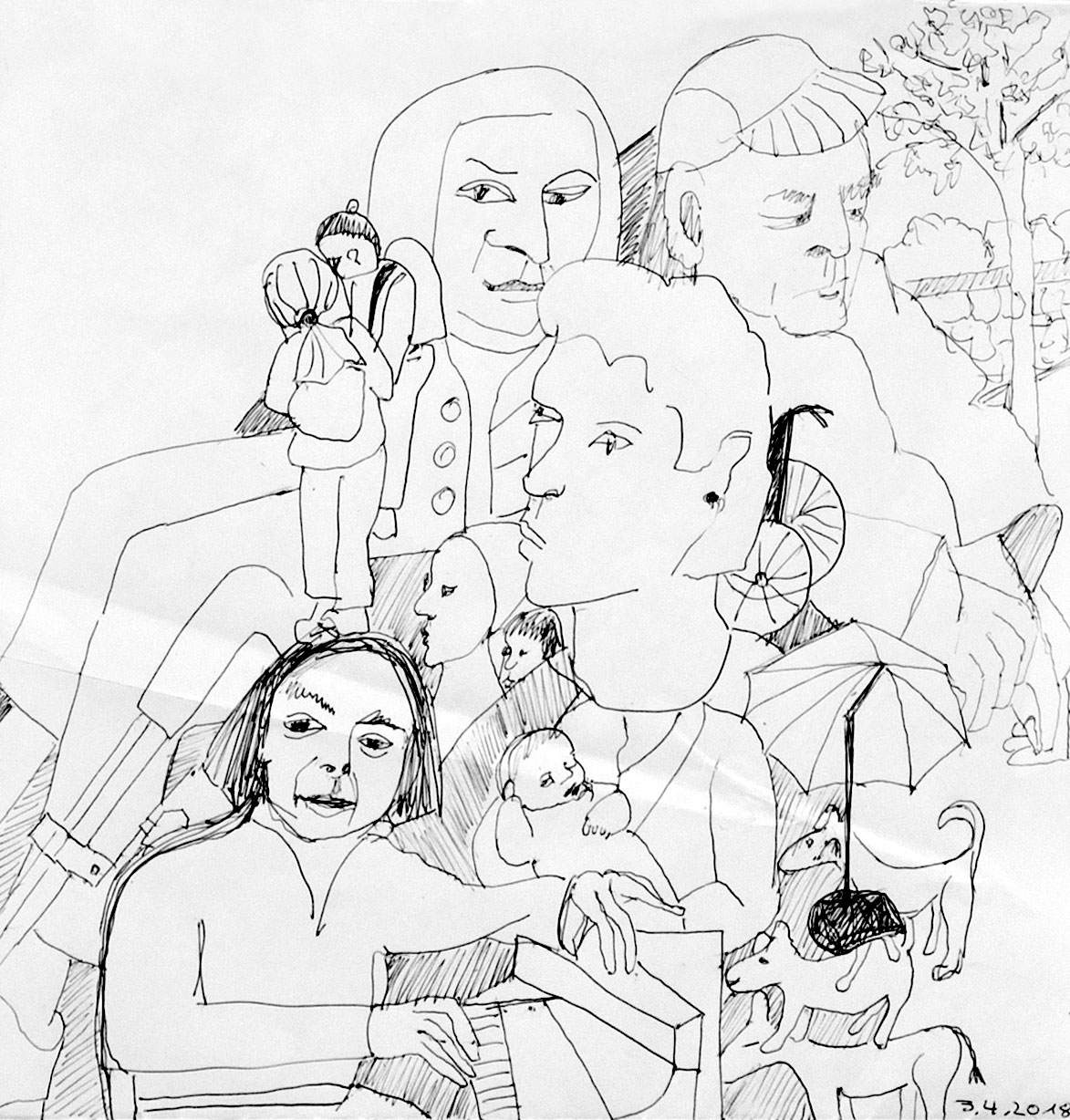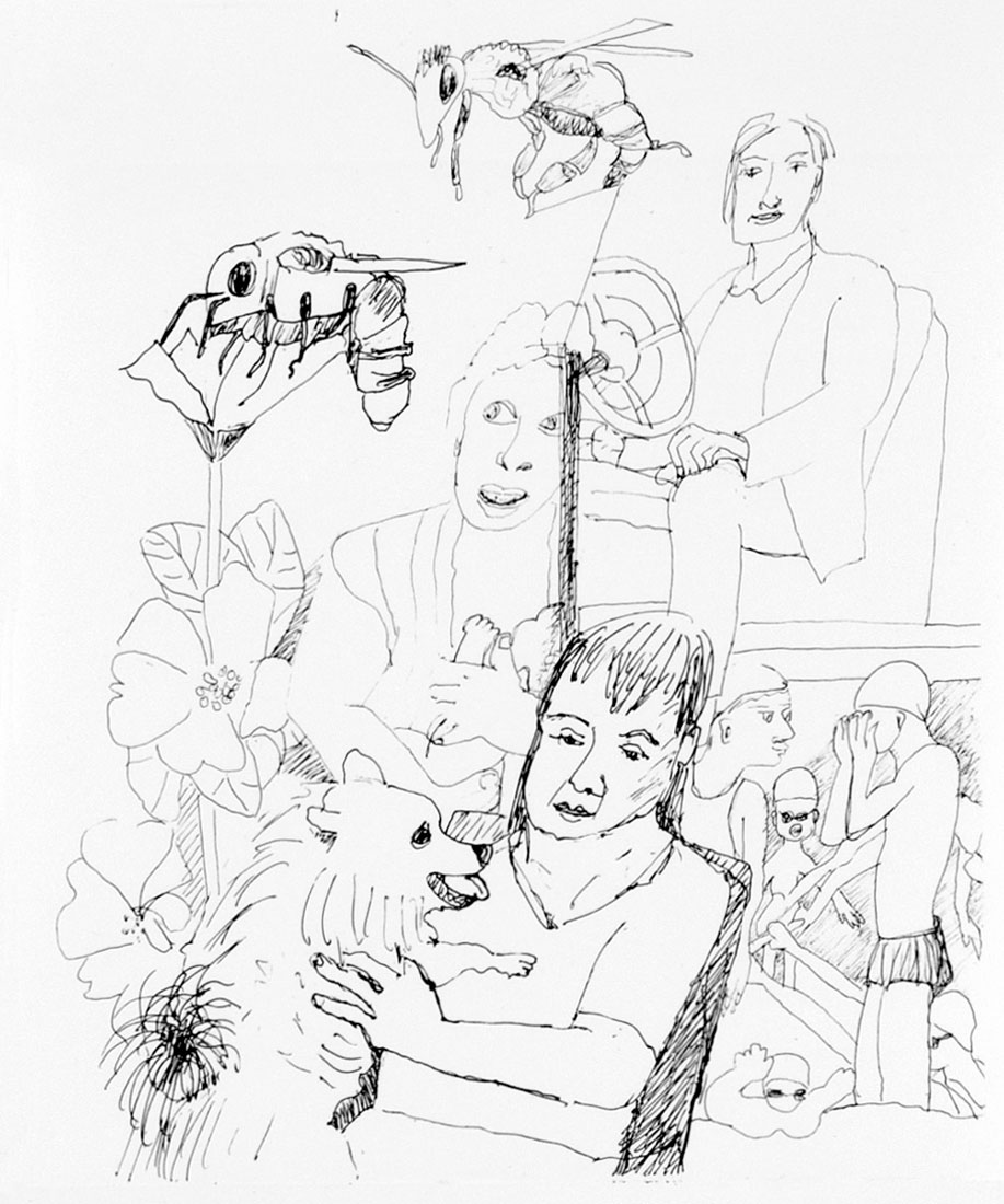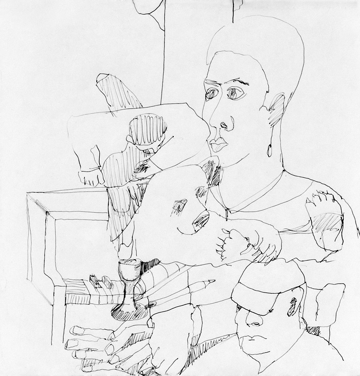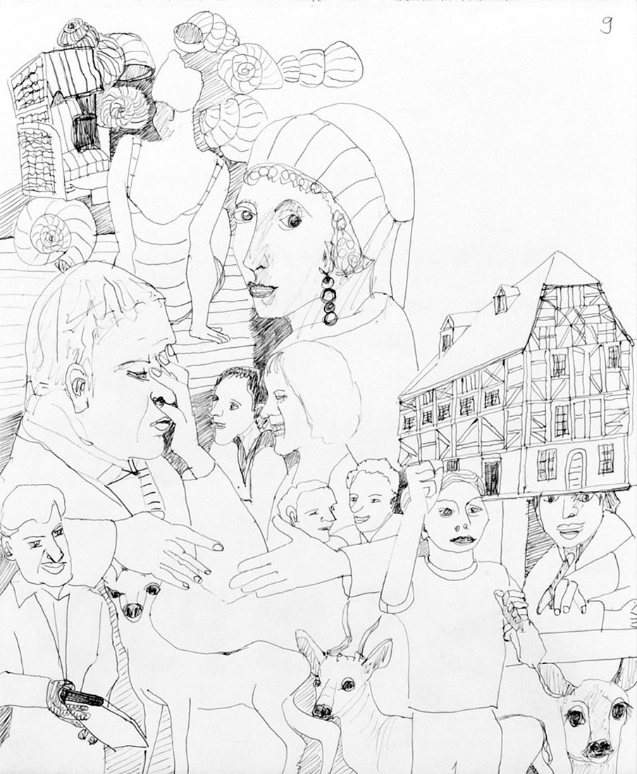 Kaleidoskopartig festgehaltene Szenen, was die Künstlerin sieht, träumt, denkt oder sich wünscht. Leporellos (je 160 x 23 cm) mit jeweils 5 Zeichnungen mit Kugelschreiber, vertikal hängend.