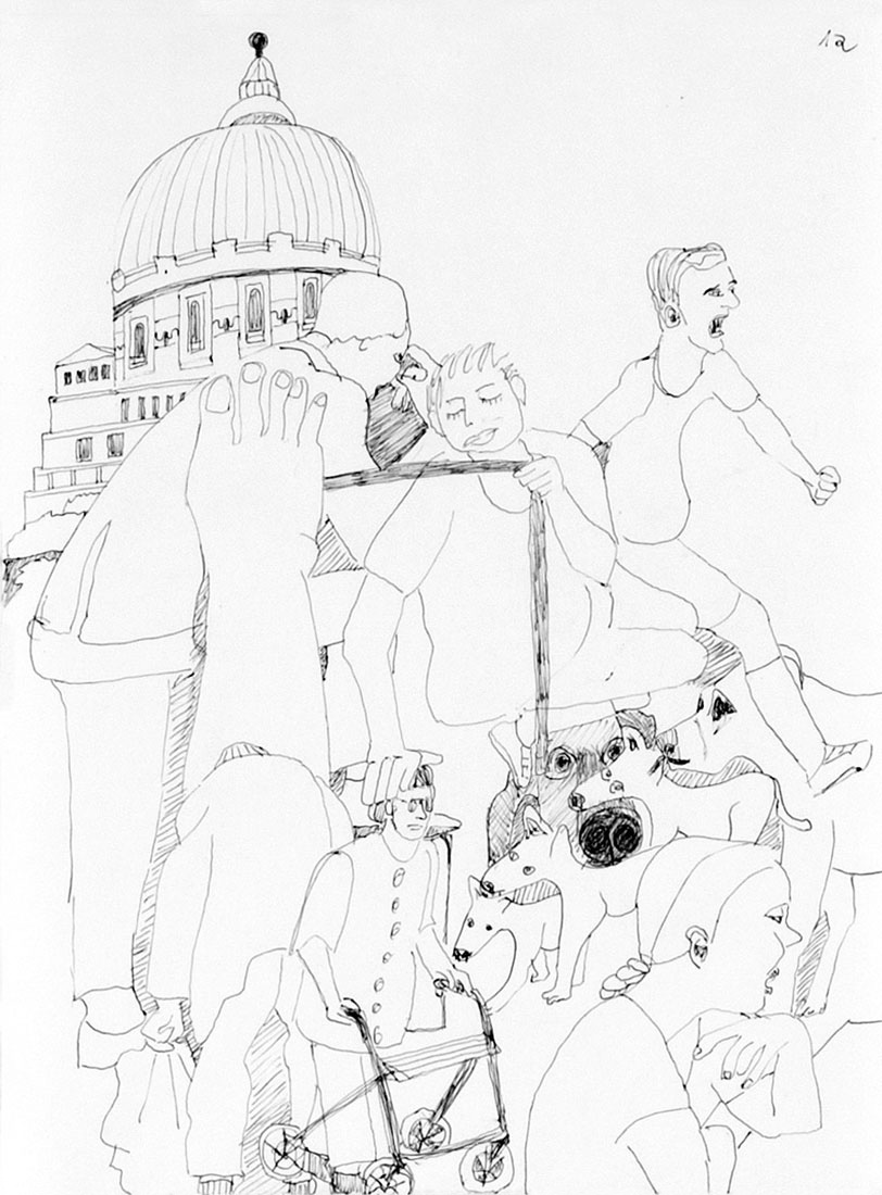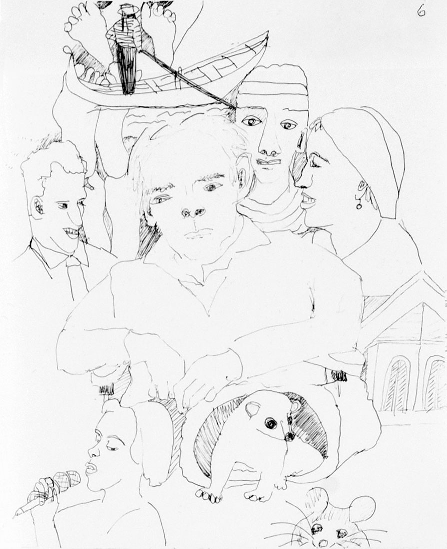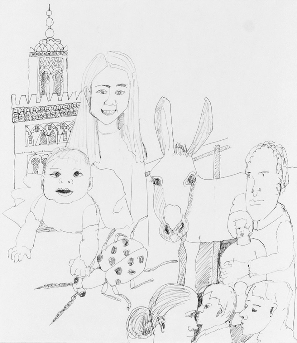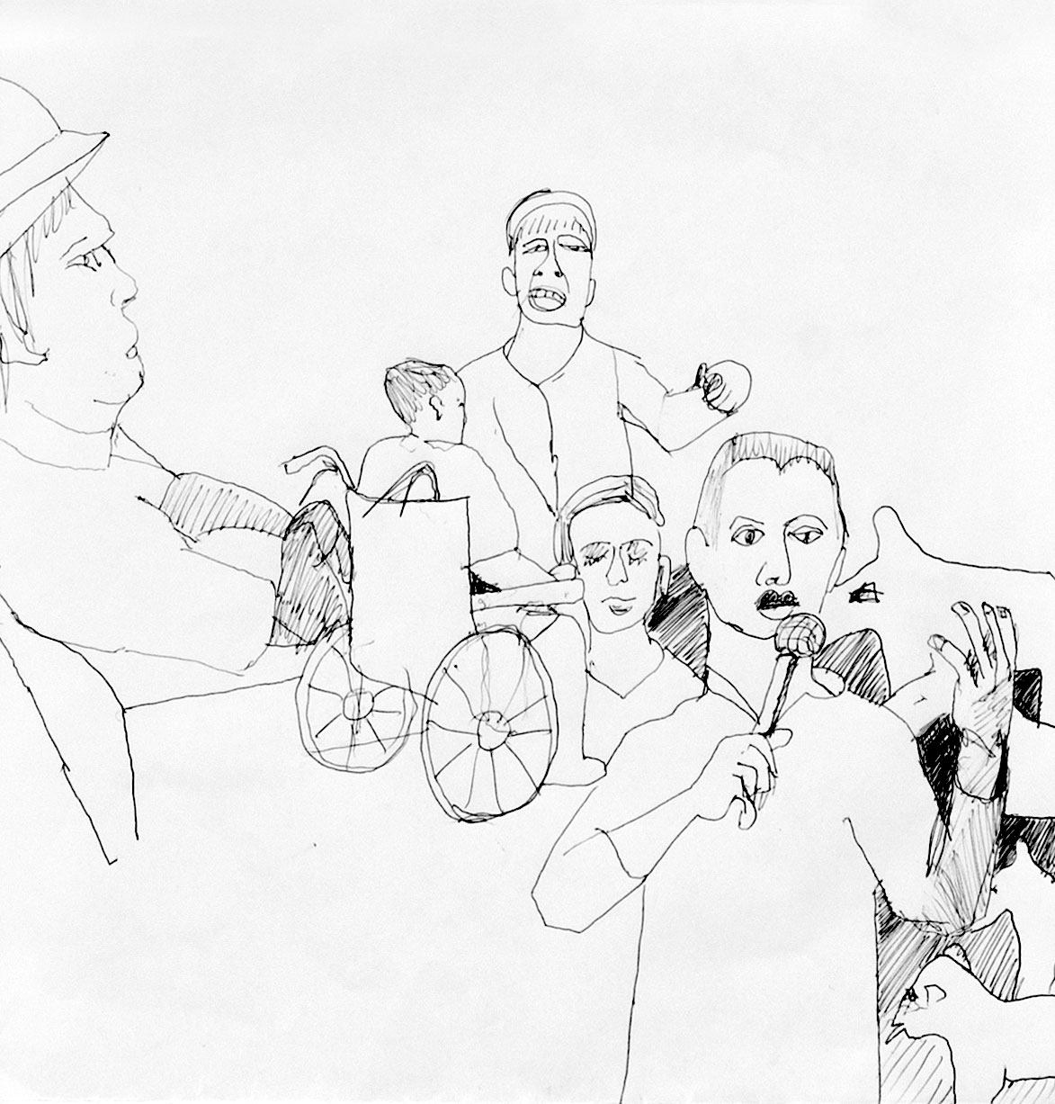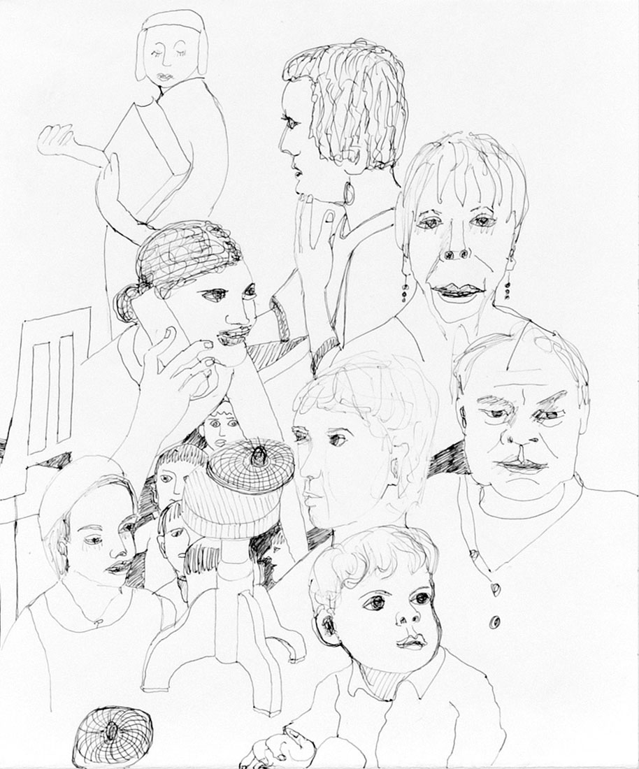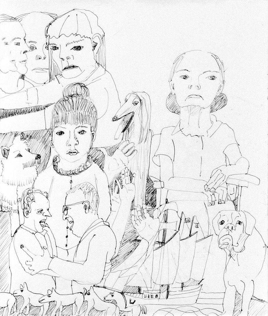 Kaleidoskopartig festgehaltene Szenen, was die Künstlerin sieht, träumt, denkt oder sich wünscht. Leporellos (je 160 x 23 cm) mit jeweils 5 Zeichnungen mit Kugelschreiber, vertikal hängend.