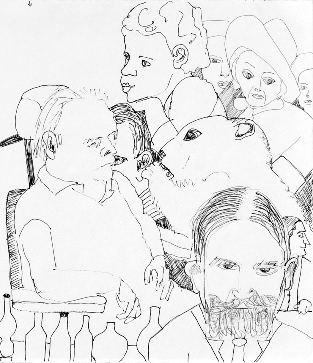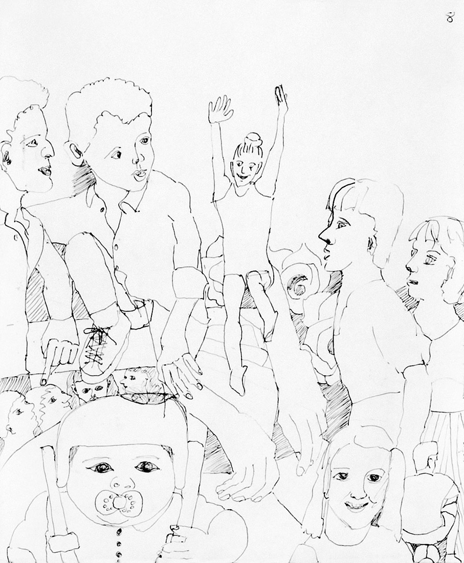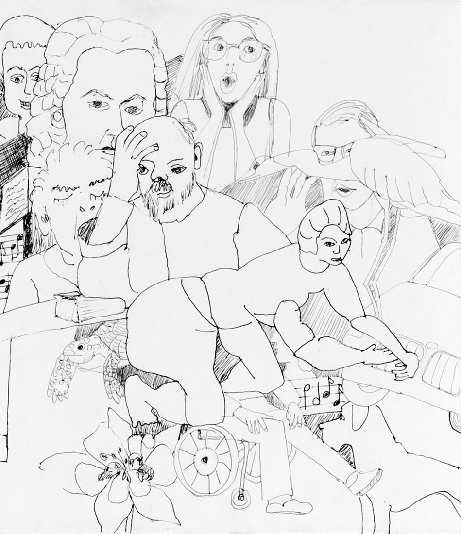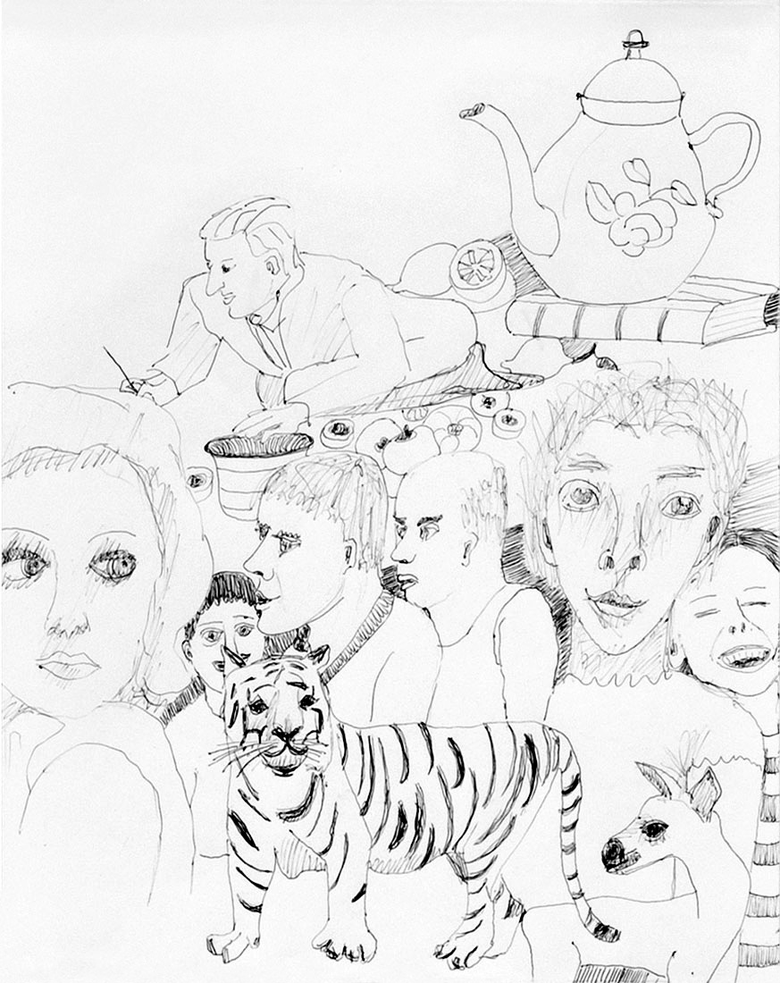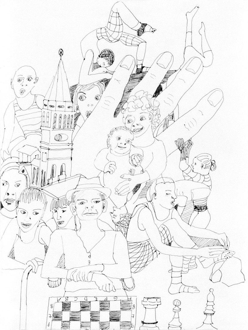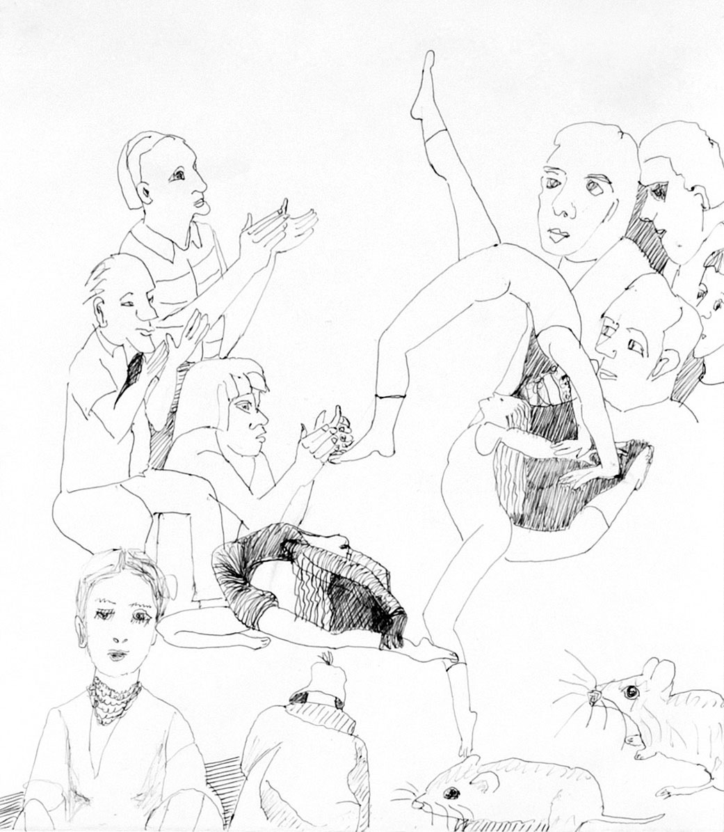 Kaleidoskopartig festgehaltene Szenen, was die Künstlerin sieht, träumt, denkt oder sich wünscht. Leporellos (je 160 x 23 cm) mit jeweils 5 Zeichnungen mit Kugelschreiber, vertikal hängend.