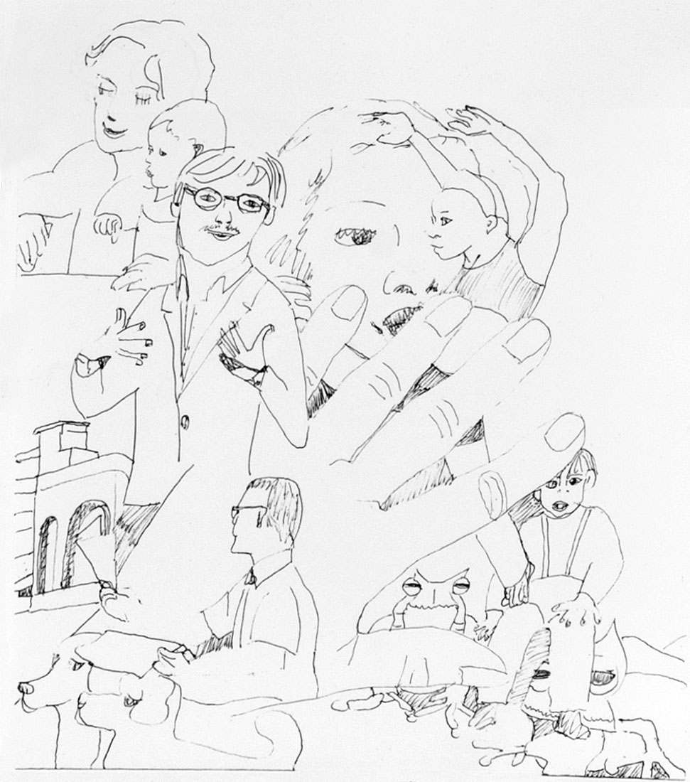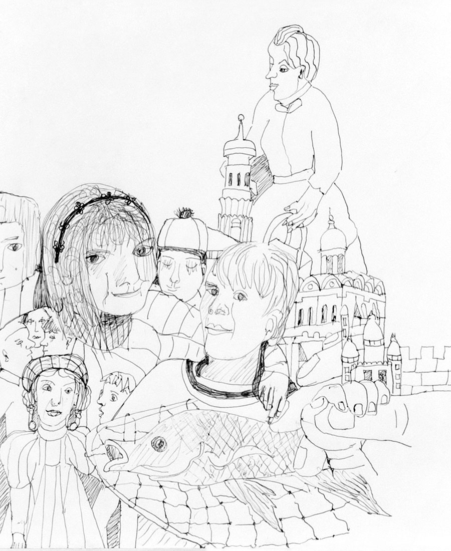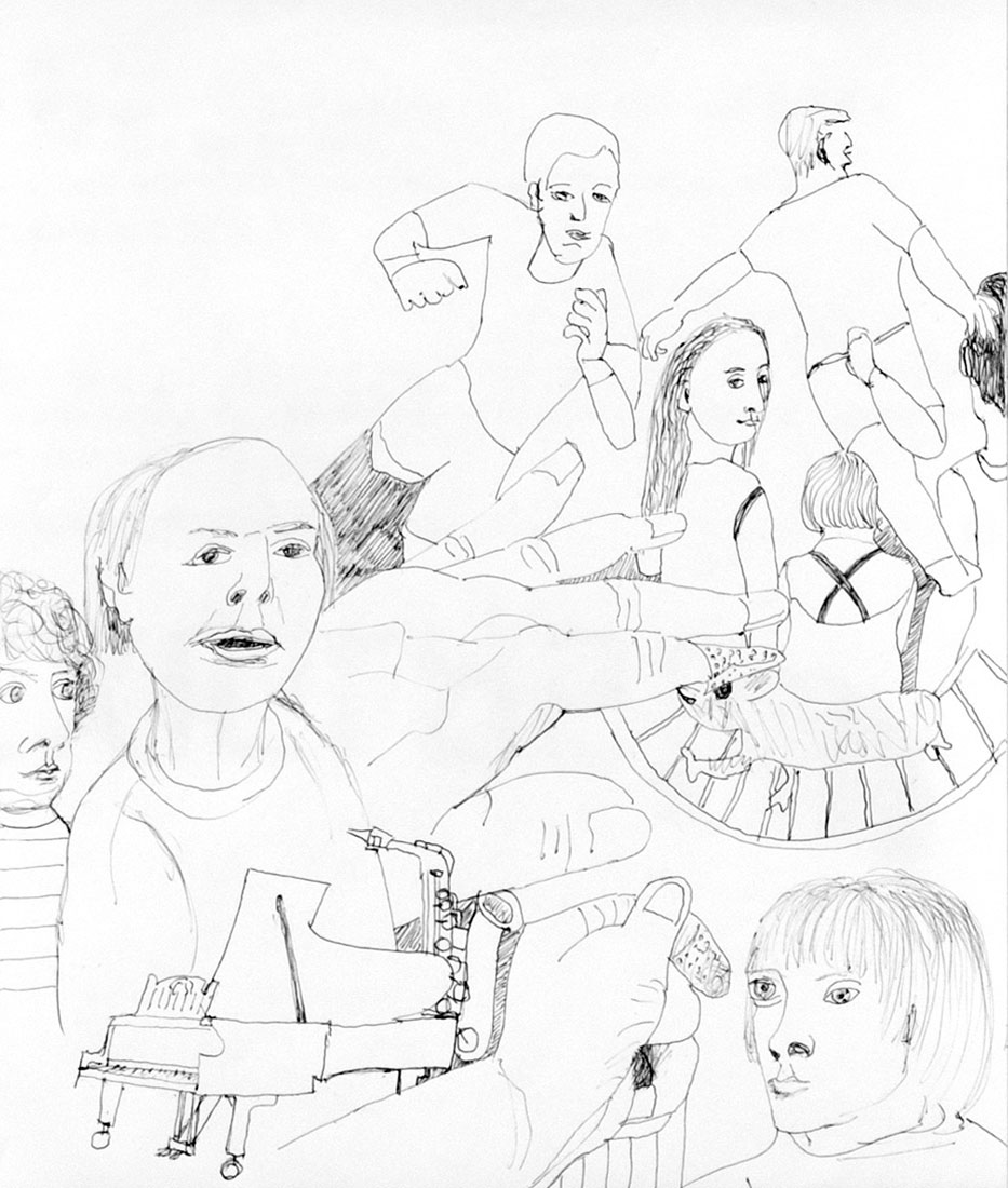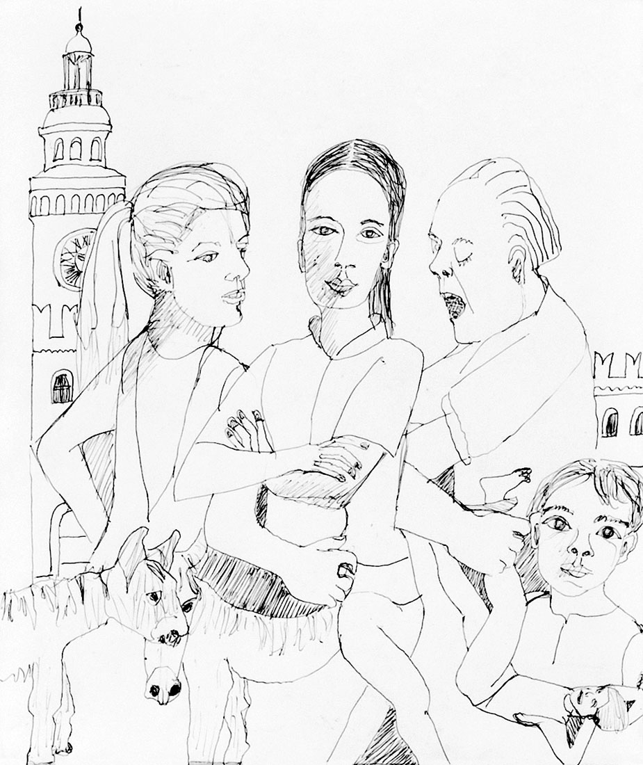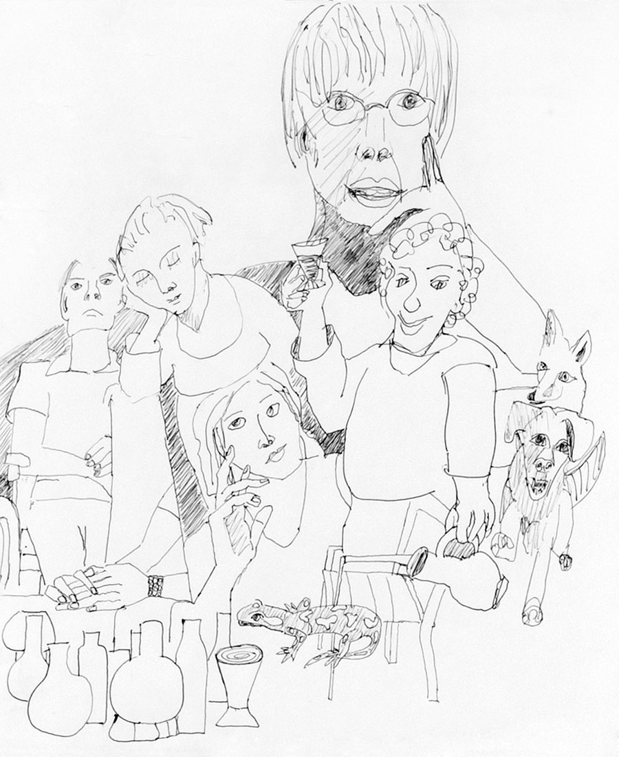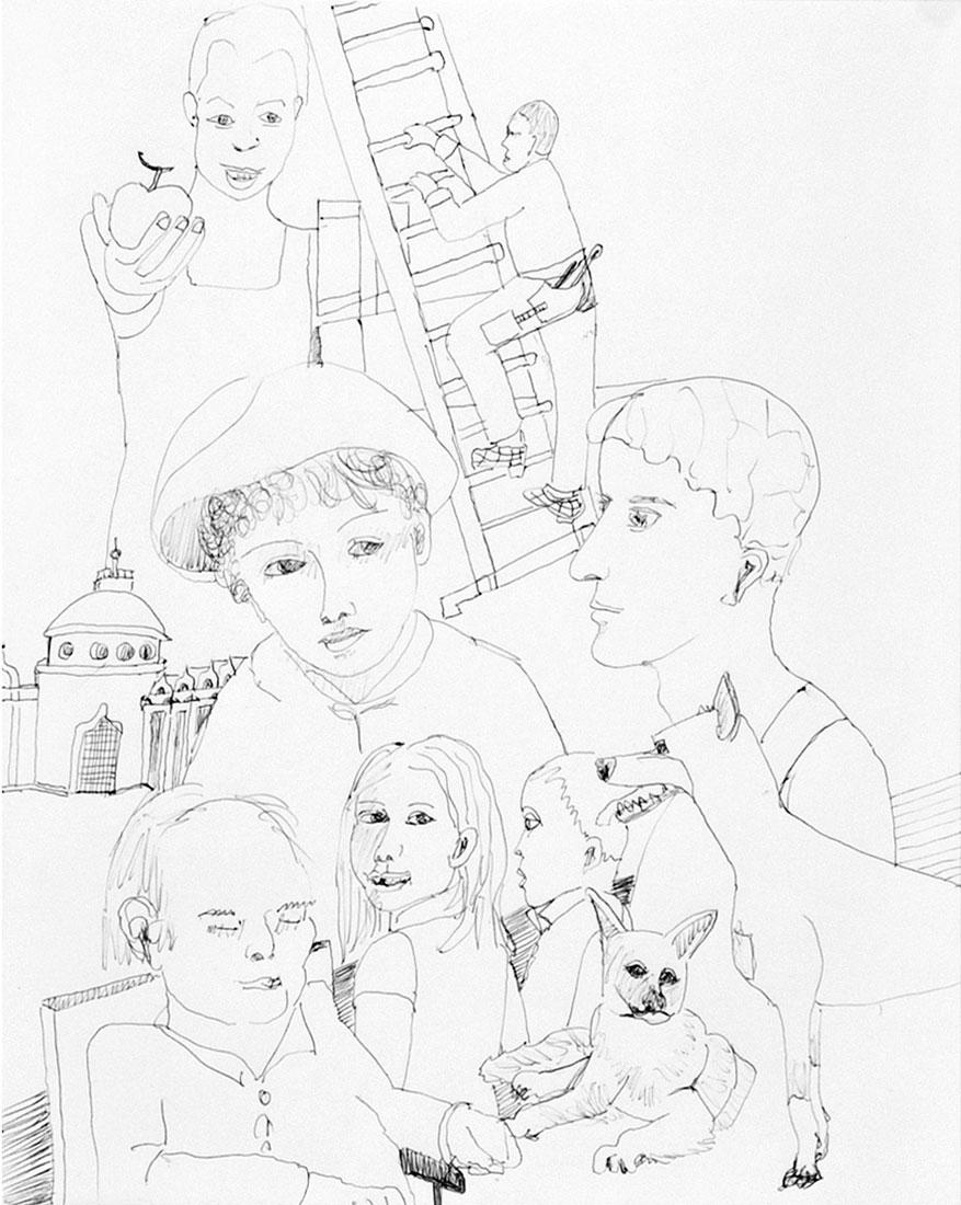 Kaleidoskopartig festgehaltene Szenen, was die Künstlerin sieht, träumt, denkt oder sich wünscht. Leporellos (je 160 x 23 cm) mit jeweils 5 Zeichnungen mit Kugelschreiber, vertikal hängend.